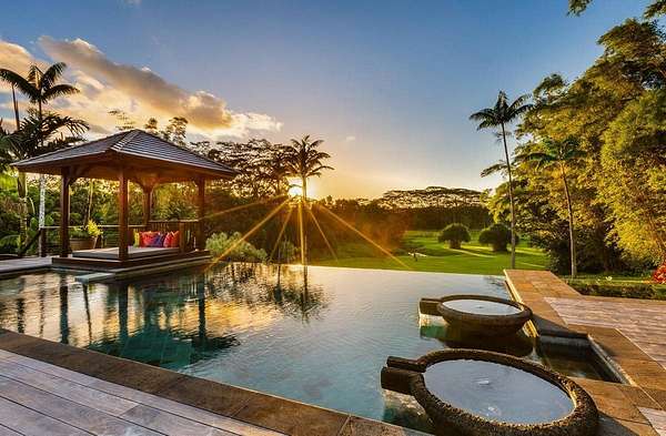 Tucked away in absolute seclusion, this expansive estate spans 3.5 acres and offers complete privacy and Bali-style luxury. With breathtaking views of Mt. Namahana as a picturesque backdrop, the 4502 sqft main residence offers four bedrooms and three and a half baths. The grand 1750 sqft great room, which includes a spacious gourmet kitchen, inviting living area, and elegant dining space, serves as the perfect venue for entertaining guests and large family gatherings. The separate bedroom suites are connected by open covered breezeways, leading to an outdoor living room-style lanai. Designed to embrace the tropical lifestyle, the residence offers extensive outdoor covered living areas and capitalizes on the refreshing tradewinds. Outside the great room, the infinity-edged salt-water pool and spa adorned with imported greenstone tiles create a captivating centerpiece, surrounded by over 3000 sqft of ipe decking and expansive outdoor covered living spaces. The spacious multi-purpose open living area downstairs is currently used as a gym. Additional features include an oversized two-car garage, air conditioning and a private detached "writer's cottage." Distinguishing itself within the neighborhood, the house is meticulously framed with termite-resistant tropical hardwoods throughout. The home features a brand new cedar shake roof, complemented by copper gutters and rain chains. Lava stone accents adorn the exterior, while custom-carved stone art pieces are integrated into carefully selected areas of the home. Breathtaking tropical landscaping and water features complete the atmosphere. The short drive to Kilauea town offers numerous amenities and conveniences. World class golf is just a few minutes away in Princeville. Famed Hanalei Bay and countless breathtaking beaches and surf spots are also easily accessible from this ideal location on Kauai's North Shore. This is arguably one of the finest properties in Kalihiwai Ridge and the entire North Shore.