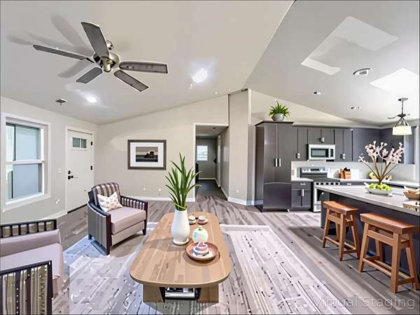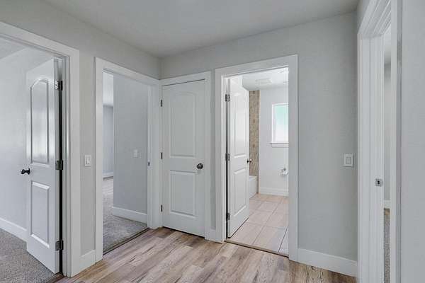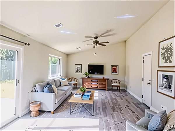 Retreat to the stunning master suite, where you'll find a vaulted ceiling, a sliding barn door leading to a spa-like bathroom with a freestanding tub, an oversized custom tile shower, a floating dual vanity, and a generous walk-in closet. The second bedroom also boasts an oversized walk-in closet, and abundant storage can be found throughout the home.