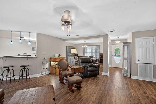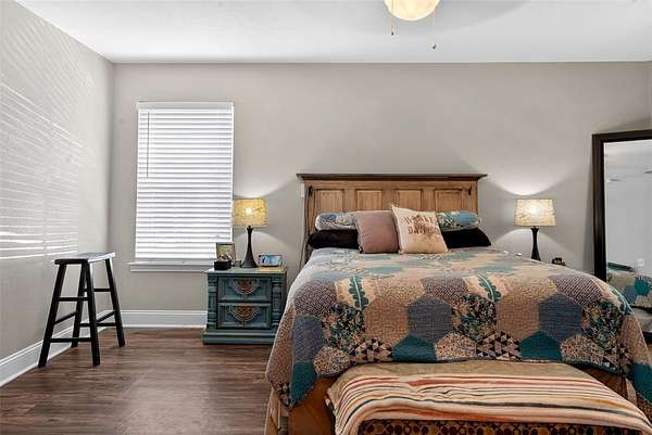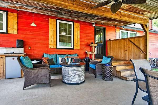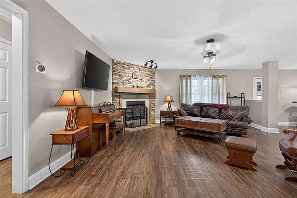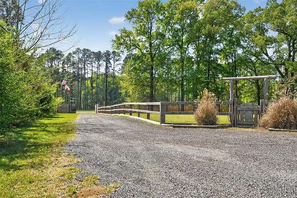 Beautifully built home situated on a private 5 acre tract with a fully fenced yard, including privacy fencing along the front and an automatic gated entrance. This well-maintained property features a spacious, open-concept layout with a split-bedroom design, offering a private primary suite separate from the additional bedrooms. The inviting living area showcases a stone fireplace and flows seamlessly into the kitchen, complete with ample counter space, bar seating, and great sightlines for entertaining. The home also offers a large primary bathroom with dual vanities and generous storage, along with a functional layout. Enjoy outdoor living with both a covered front porch and covered back patio, perfect for relaxing or hosting guests. The property includes a walking path that runs around the entire perimeter and through the center, adding to its charm and usability. Another bonus is a storage building and a small shop with electricity, providing ample space for hobbies, workspace, or extra storage. Schedule your showing today!