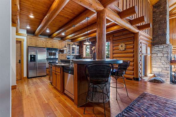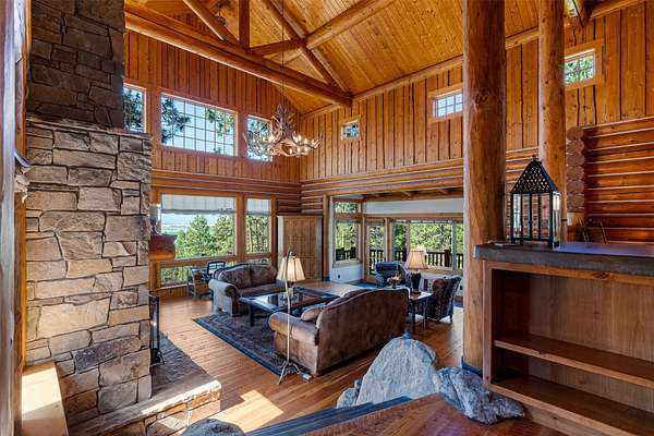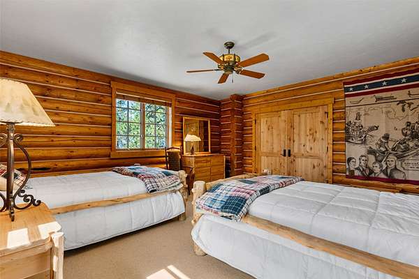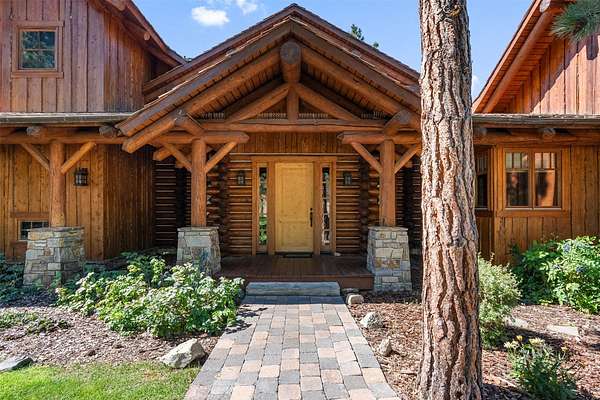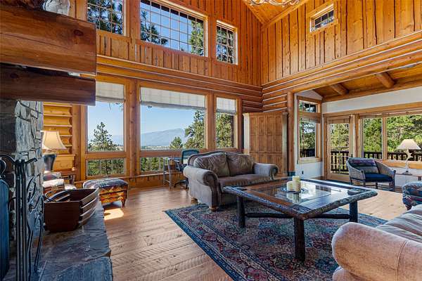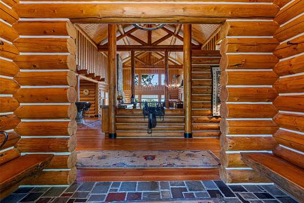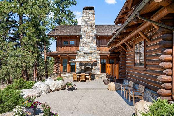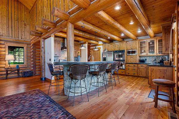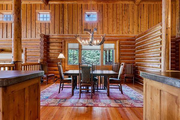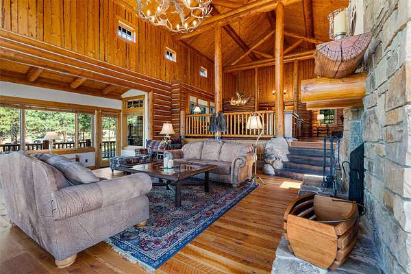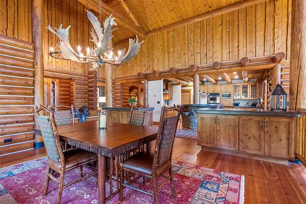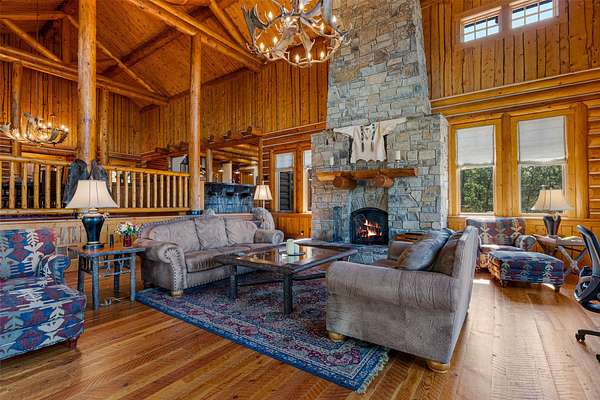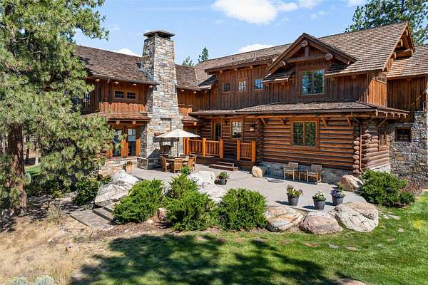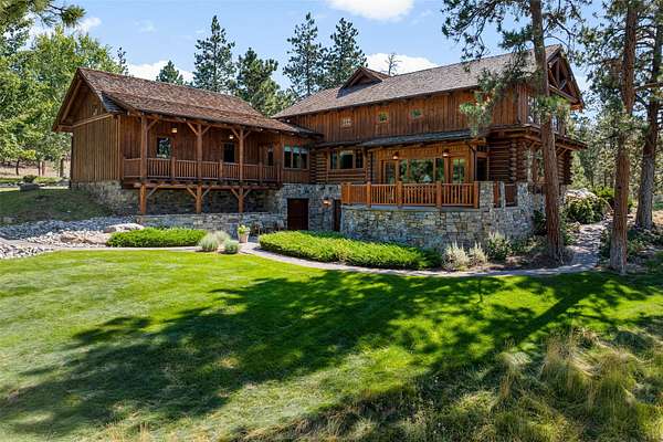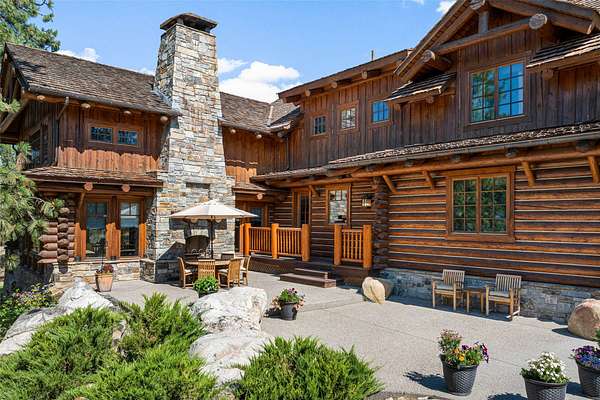 Incredible, custom Rocky Mountain log homes on 4.06 acres in 2 parcels, featuring just over 6600 ft.2 ; of living area featuring an open floor plan and massive living room with a huge stone double sided fireplace and incredible views looking out the floor to ceiling windows to the Como Peaks and Bitterroot Mountain Range. The large custom kitchen is fit for the finest chefs with high-end appliances and granite countertops. This home is offered furnished and features 4 bedrooms and 4 1/2 bathrooms with an attached two car garage. There are numerous outdoor entertaining areas looking out at the views and beautiful landscaping. This property is located at the end of the Mascot Trail. All of this is located in the incredible gated Stock Farm Club with access to a world class Tom Fazio golf course as well as an equestrian center, shooting range and an amazing clubhouse with world class dining. Membership is not included with this home but buyers can apply for membership. Please contact listing agent regarding amenities and contact information for membership.