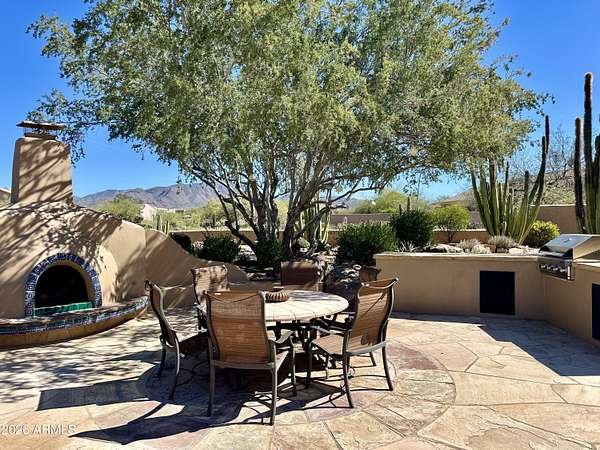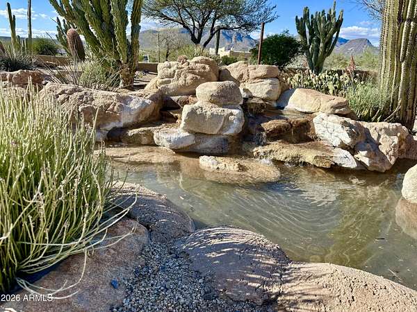 Discover desert living at its finest in this beautifully furnished single-level home Cave Creek home with breathtaking views of Elephant Mountain.This spacious 4-bed, 3-bath home offers an open-concept layout connecting living, dining, and family rooms- ideal for entertaining and everyday comfort. Highlights include 3 fireplaces, a bonus room, split-bedroom design for privacy, and a 3-car extended garage. Step outside to enjoy mature desert landscaping and a peaceful water pond feature, creating a relaxing outdoor retreat.No HOA offers added freedom and flexibility.Located just minutes away from downtown Cave Creek, restaurants, shops,and popular hiking trails and beautiful desert scenery.*Seller to include interior and exterior furniture, decor, appliances and wall-mounted art.
