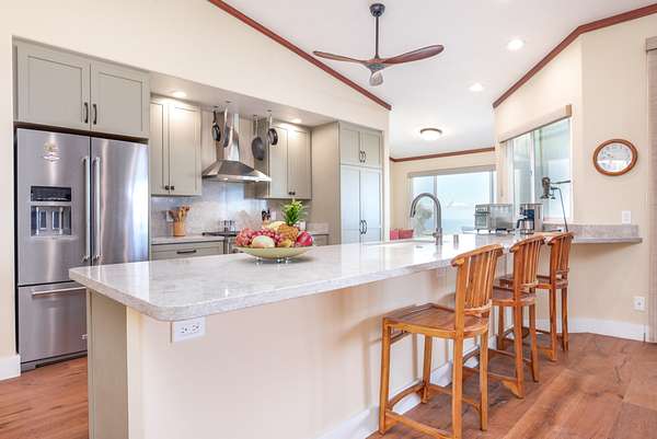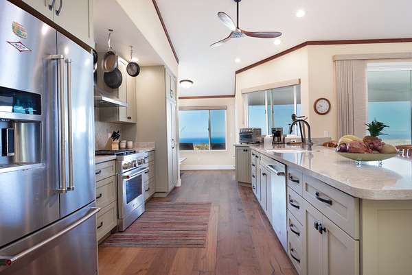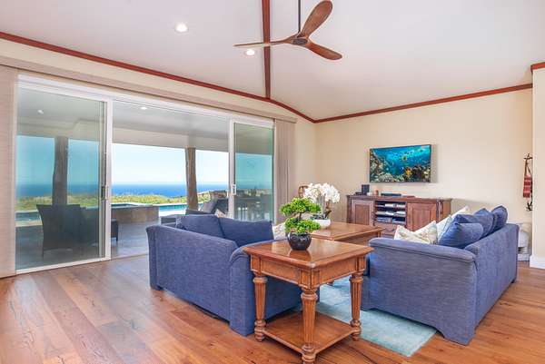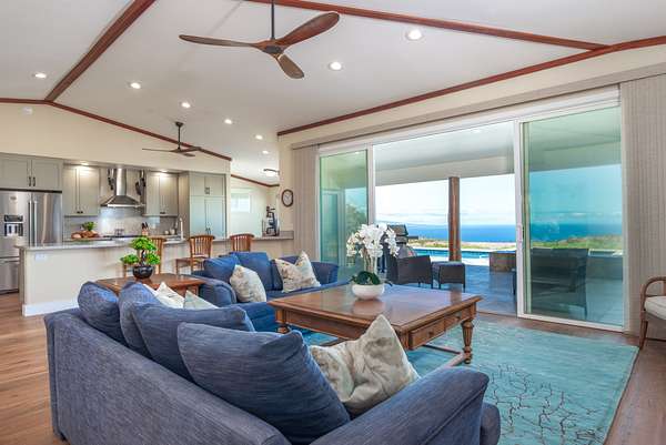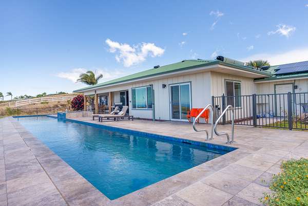 This single-level 3 bedroom, 2-1/2 bath Kohala Ranch home sits sits on a 3 acre flag lot at the end of a cul-de-sac in the middle "Meadows" of Kohala Ranch. This location offers privacy and uninterrupted ocean views and is at a comfortable elevation of approximately 1600 feet above sea level. The home is oriented so that most of the rooms have windows toward the ocean. The primary suite is on the north side of the home has an office, walk-in closet, double vanity, separate shower and soaking tub. The two guest bedrooms share a bath on the south side of the home. The kitchen has an open layout with plenty of cabinets. You have your choice of dining areas: an eat-in nook on the ocean side of the kitchen, a dining room by the entry, or out on the large covered lanai to take in the sun setting. The two car attached garage opens to the laundry room, this allows easy access for bringing groceries to store in your pantry. Utility bills are low at this carefully planned residence. A photovoltaic system keeps electric bills to a minimum. Landscaping was designed to provide for tropical color outside all your windows, but minimize water consumption. Kohala Ranch is a gated community with lots up to 12 acres, and CC&Rs for consistency in design. From the lower gate, the beaches of the Kohala Coast are a 10-20 minute drive. The upper gate opens onto Kohala Mountain Road providing easy access to the up country town of Waimea (Kamuela) with supermarkets, schools, medical offices, Saturday farmers markets, and live entertainment at the Kahilu Theatre.