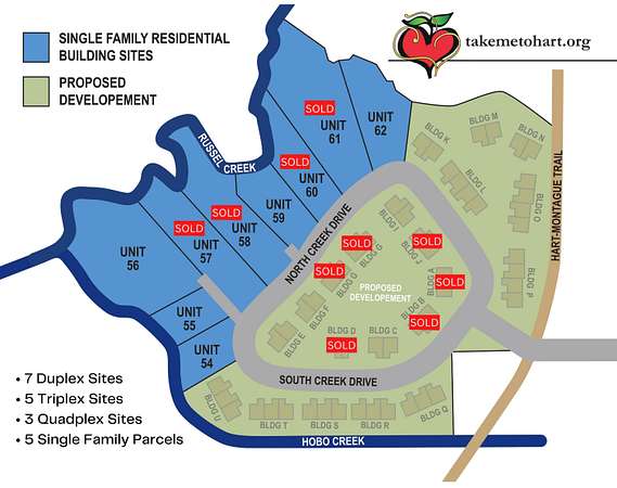 Over half an acre at The Creeks! Single family residential building site available for your new home. All sites are served with paved roads, city water and sewer, natural gas, cable and high-speed internet. All road, driveway and lawn maintenance will be provided through the association. This development is surrounded by woods and framed by Russel Creek and the Hart Montague Rail Trail. Living In the City of Hart provides a sense of community from the quaint downtown shops and restaurants to school spirit to events on the commons. Imagine evening summer concerts with Hart Lake as the background. Boating and fishing, lake Michigan beaches, sunsets and sand dunes all within 11 miles. We encourage you to explore the Creeks, our community and all it has to offer.