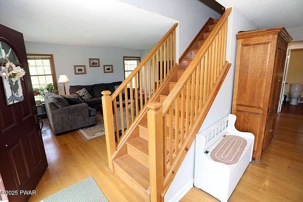 Stunning country cape on 4.76 acres with gorgeous pond and pastoral views. This well-built home features an open floor plan with oak flooring and Pella windows. The spacious kitchen with island has Corian counters and oak cabinets and there is access to a large Trex deck overlooking the pond. The dining area, family room and living room provide ample space for friends and family. A laundry room, full bath and main level bedroom, currently used as an office, complete the main level.The second floor has two guest bedrooms, full bath and primary bedroom with it's own private full bath. The basement is finished with a woodstove, wet bar, second refrigerator and storage room. The property is captivating with a 12' deep pond, separate orchard, organic garden, plus 14x28 outbuilding and separate shed. The 2-car attached garage provides additional room for vehicles and lots of storage. Don't miss this great country property!