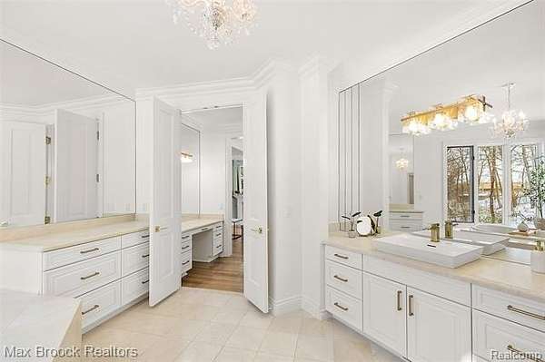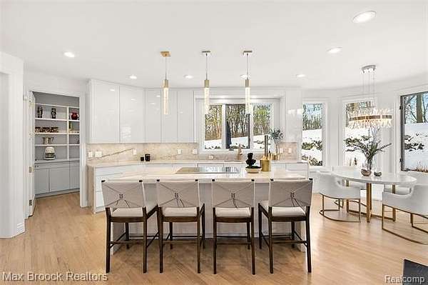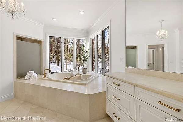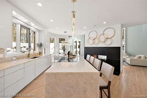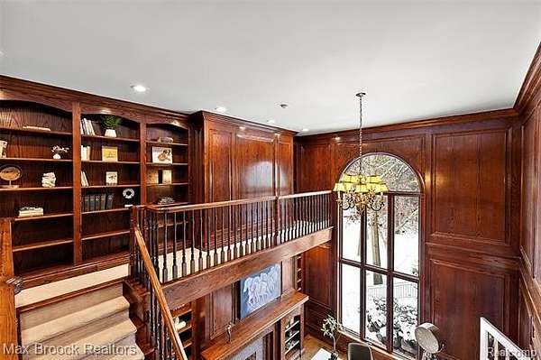 Indulge in exquisite comfort and luxury in this masterfully transformed estate, updated by Sterling Custom Homes and Renovations. Tucked within a quiet enclave of executive residences, this remarkable home is moments away from every convenience. The grand two-story foyer, with gleaming marble floors, introduces an interior that delights at every turn. The living room stuns with soaring ceilings, a beautiful bar area for entertaining, and a natural flow that connects effortlessly to both the custom dream kitchen and the breathtaking two-story library. Wrapping you in cozy sophistication, the library creates a versatile space with countless possibilities. Expansive windows throughout frame magnificent views of the surrounding natural beauty. The kitchen is a work of art, featuring a dramatic stone waterfall island and custom cabinetry. A striking two-sided fireplace, shared with the family room, adds both warmth and architectural distinction to this inviting space. The first-floor primary suite boasts luxurious finishes and a spa-inspired bath designed for the ultimate in relaxation. Upstairs, spacious and beautifully designed bedrooms and bathrooms provide comfort and privacy for family or guests. The expansive walkout lower level is created for entertainment, including a large recreation area, a generous bar, and a beautifully appointed ensuite bedroom. Outdoors, a serene stone terrace invites you to unwind amid lush natural surroundings and complete privacy. Designed by Art Harrison Interiors, this home reflects modern luxury at its finest, with every inch updated for refined, effortless living, including new plumbing, faucets, and hardware. Additional highlights include a whole-house generator, six HVAC units, and three hot water heaters, with two replaced within the past two years. The home also features four recently replaced furnaces, two newer air-conditioning units, and newly added heating in both garages, providing year-round comfort and convenience.