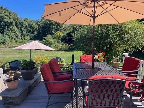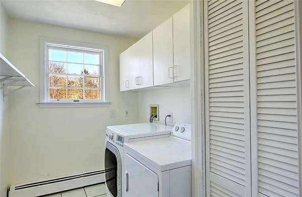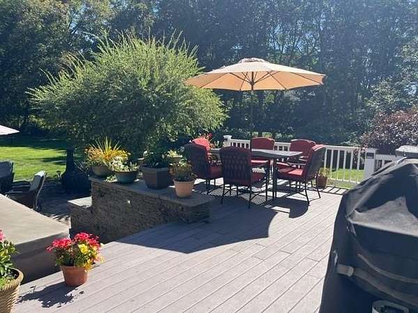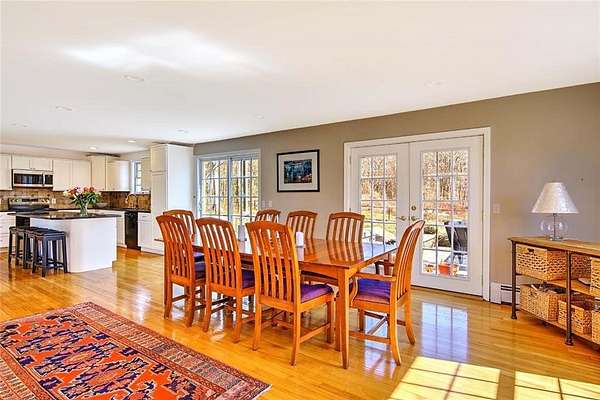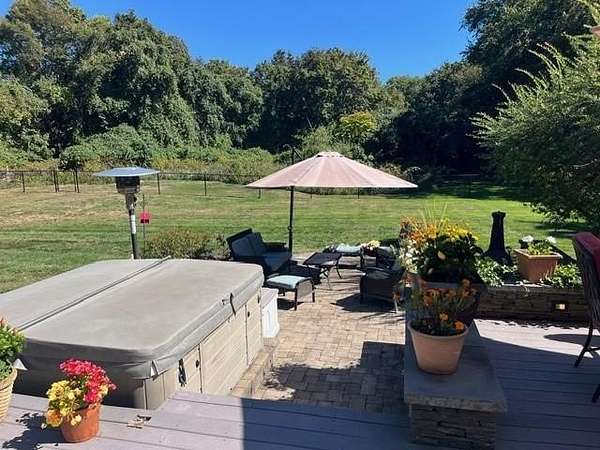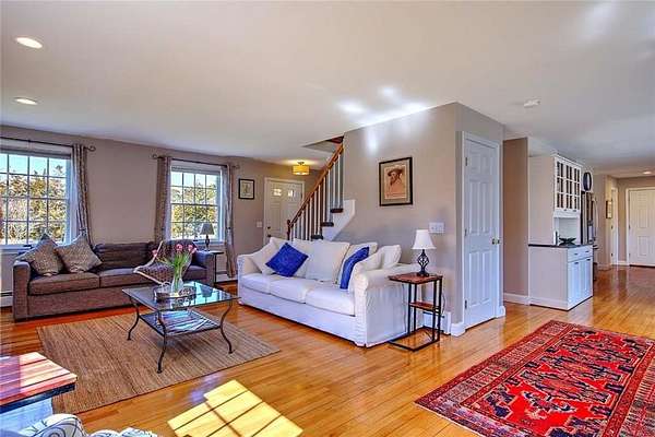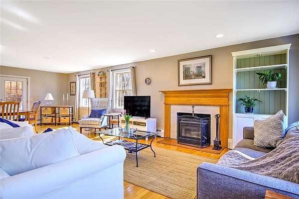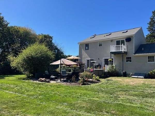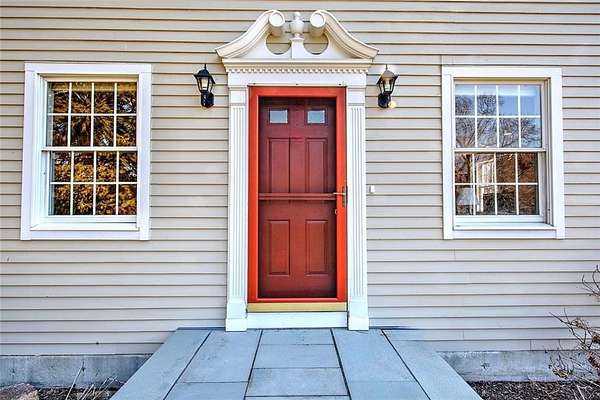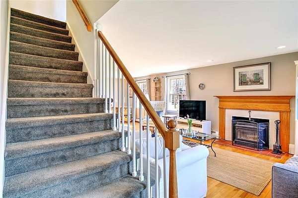 Gorgeous colonial in one of Jamestown's premier neighborhoods. A quiet, walkable neighborhood of 2-acre properties, with 2 scenic freshwater ponds surrounded by walking paths that are just steps away. Deeded beach access to Narragansett Bay for swimming, kayaking, clamming & fishing. Close to dining, shopping, schools, beaches, golf, yachting; easy access to bridges for travel to Newport, Narragansett and beyond. Partially wooded and beautifully landscaped, private yard, with fenced-in area that includes a blue stone patio, deck, mature gardens, hot tub, fire pit. A wonderful outdoor area for entertaining or quiet al fresco dining. Bright and sunny large chef's granite kitchen with great flow, wine bar, newer appliances and beautiful backyard views. Adjoining the large kitchen is a fireplaced living room, eat in dining area and a flex room for use as a separate dining room, playroom or office. Upstairs is the ensuite master bed and bath with a deck overlooking the morning sunrise and 3 other generous bedrooms and a bath. The baths are beautifully appointed. Lower level is dry and has finished room for play, media or any use. Many extras in this beautiful home include: hot tub, jacuzzi, gleaming hardwoods, dog fence, boat storage area, E-car charger, 1st floor spacious laundry room, half bath, custom kitchen cabinets, soft closing drawers, loads of storage and mature plantings. Jamestown is a great lifestyle of beauty, coastal charm, convenience, quiet & easy living.