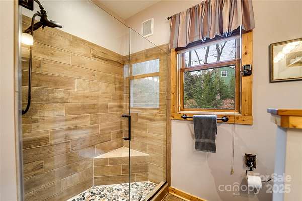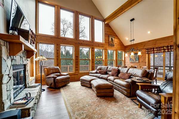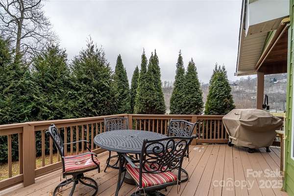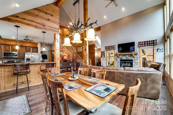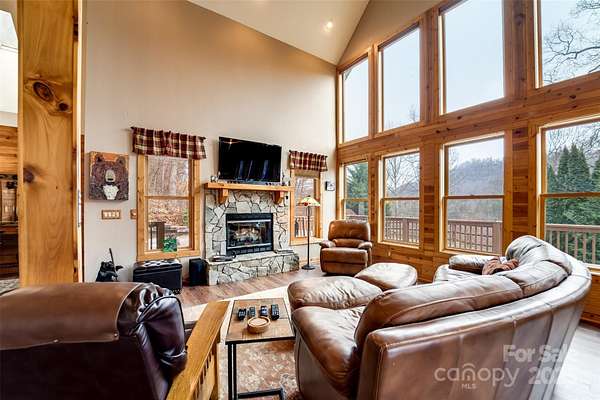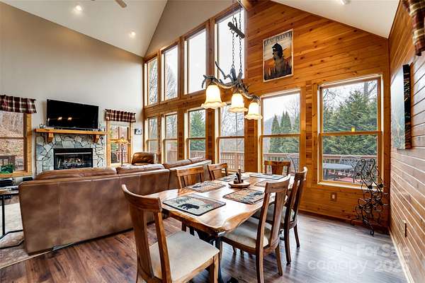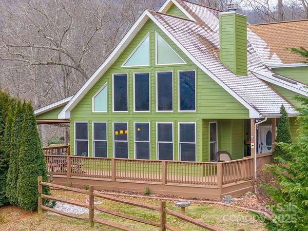 This mountain style A-frame home is nestled in the gated community of Campbell Mountain Estates and offers effortless mountain living with easy paved access and a level, low-step entry to the main level. Inside, an open-concept floor plan is filled with natural light, highlighted by a dramatic wall of glass showcasing the surrounding mountain views! A striking stone gas fireplace anchors the living space, creating the perfect gathering spot. The home flows seamlessly into a spacious dining area and breakfast bar, ideal for everyday living or entertaining. The open kitchen features granite countertops, stainless steel appliances, a gas range, and a generous pantry closet for ample storage. The primary suite is conveniently located on the main level, while the hallway leads to a half bath, laundry area, and access to the screened porch-a favorite spot to unwind. Upstairs, you'll find two additional bedrooms, a full bath, and a loft area perfectly suited for a cozy home office or reading nook. Outdoor living shines with year-round views enjoyed from inside the home or on the wraparound deck. The property also includes a one-car garage, fenced backyard, storage area, firepit, and a whole-house generator, all adding comfort and peace of mind. Being sold mostly furnished!