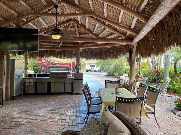 This huge 3,831 sq. ft. lot is perfectly located just across from the satellite pool/spa, bathhouse, laundry and guest parking. Backing onto a peaceful preserve with mature, lush tropical landscaping, this property offers the ideal blend of convenience, privacy, and natural beauty. At the heart of the lot is an expansive tiki hut with a brand-new roof thatch installed in January 2024. Inside, you'll find two ceiling fans to keep you cool, upgraded seating and dining furniture for comfort, a large TV, and a well-equipped outdoor kitchen complete with a bar and plenty of storage. What truly sets this property apart is its generous size. Beyond the tiki, there's plenty of room for outdoor dining, with space for a table and chairs to enjoy meals al fresco. The extended patio behind the tiki is the perfect spot to add a water feature, creating a serene retreat. The expansive side yard provides additional room for entertaining. This lot has a warm, welcoming "home away from home" feel.