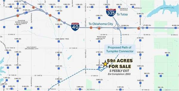 TURNPIKE FRONTAGE FUTURE: 59+/- Acres - South Peebly planned as the first exit south of I-40 Interchange in OKC off the new 'Outer Loop' (East West Connector) - Future Development Raw Land. Positioned to become the first right-hand turn off the new S Peebly Road exit, this 59+/- acre tract offers rare control of prime frontage at the intersection of long-term infrastructure expansion & 50-year growth projections. Located in the Newalla area within Oklahoma City limits in Cleveland County, the site sits along the new corridor connecting Interstate 40 (Tulsa ? OKC) to Interstate 35 (OKC ? Dallas). Few properties offer this level of future visibility & access. Positioned as the first property off the new interchange along Interstate 335 connecting I-40 & I-35, this 59+/- acre offering provides an early-mover advantage in the growth corridor between OKC & Norman. Comprised of two raw land tracts totaling ~59 acres, the property features over 660 feet of frontage on S Peebly Road, providing outstanding visibility, access flexibility, & development versatility. Strategically located between Norman & Shawnee, the owner will divide upon accepted offer & entitlement, & private utilities are permitted. Early positioning along major transportation projects consistently drives long-term value. Secure frontage, scale, & future access in one of the metro's most promising corridors. ***Please note: References to a proposed turnpike exit, interchange, or roadway improvement are based on public planning info. Construction timelines, funding, final design, & access configuration are subject to change. Illustrations are for informational purposes only & actual lines are subject to final ROW & Survey.