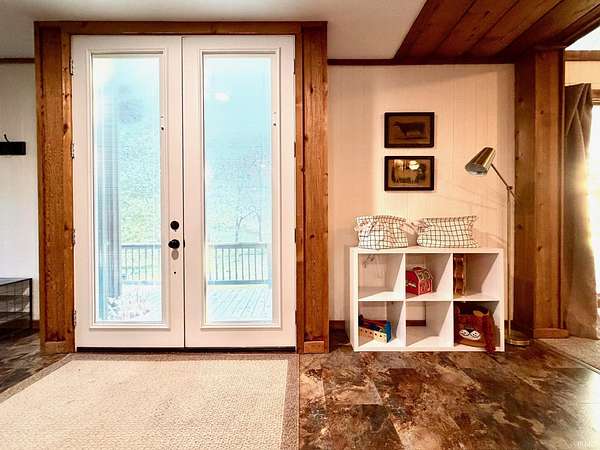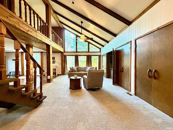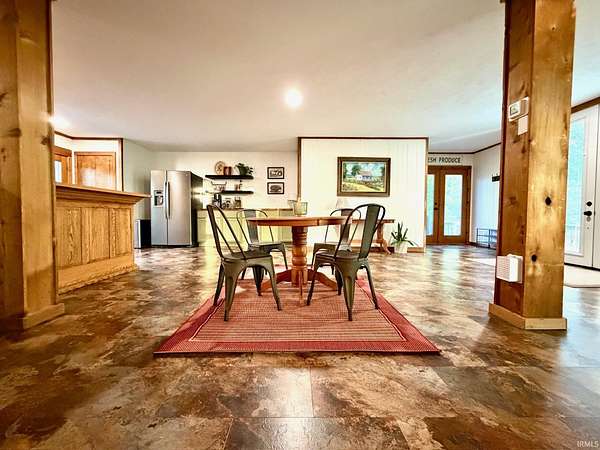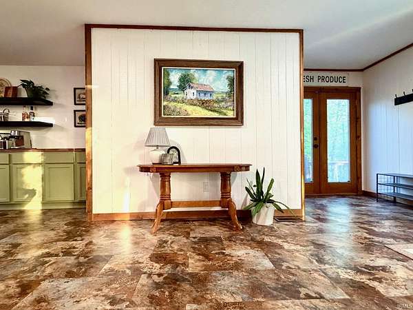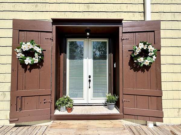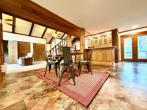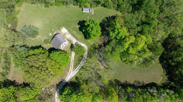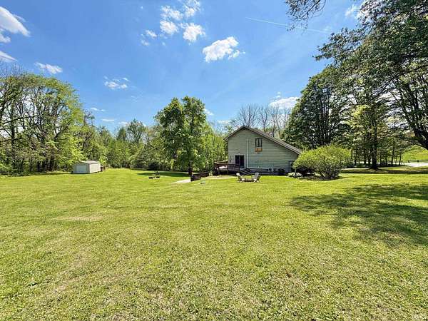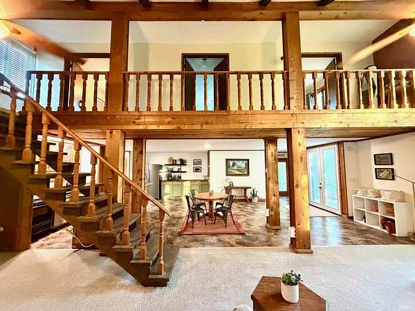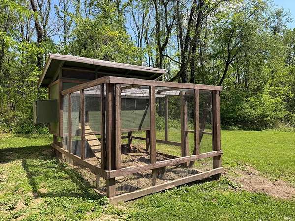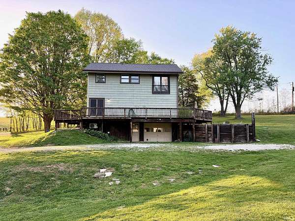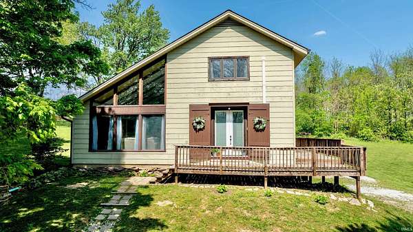 Peaceful living on 4.2 beautifully maintained acres, this inviting 2 bedroom, 1.5 bath home offers privacy and quiet. Step through the French doors into a warm, open concept living space filled with natural light, featuring exposed beams, a two story living area with floor to ceiling windows, and a spacious dining area perfect for gathering. The kitchen offers a hammered copper sink, island with breakfast bar seating, a coffee bar alcove, and two pantries, with rear doors leading to a deck ideal for relaxing or entertaining. Upstairs you will find both bedrooms along with a beautifully updated bathroom featuring dual vanities and a clawfoot tub, while a convenient half bath is located on the main level. The unfinished walk out basement provides excellent storage and garage space, with potential to create additional finished living area if desired. Outside, enjoy the wraparound deck, fire pit, large Amish built shed, and custom chicken coop, all surrounded by peaceful acreage. Notable updates include updated electrical with new panel and breakers (2022), mini split systems in bedrooms (2023), built in kitchen cabinetry and coffee bar (2022), new dishwasher (2023), fresh interior paint in bathrooms (2026), and multiple outdoor improvements.