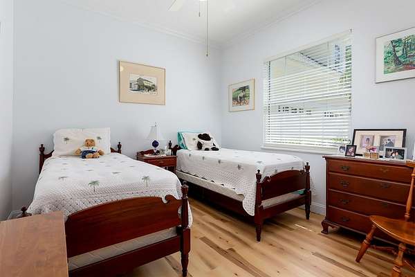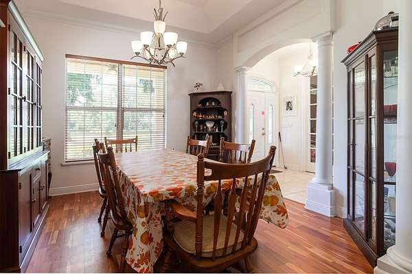 Inside this stunning 4-bedroom, 3.5-bath concrete block and Hardee board home, you'll be greeted by timeless elegance. Ten-foot ceilings, tray ceilings in the master and dining room, crown molding, graceful arches and columns, and rich cherry flooring all contribute to the home's refined character.