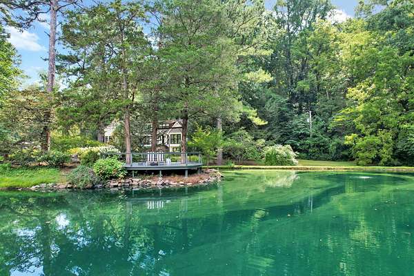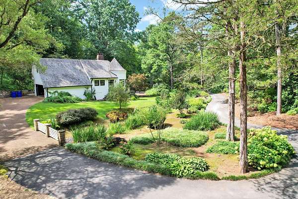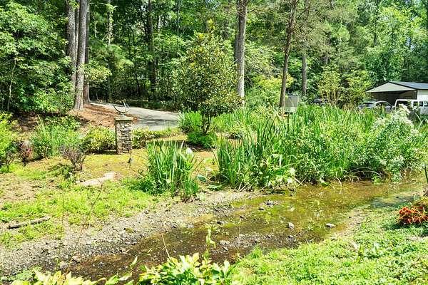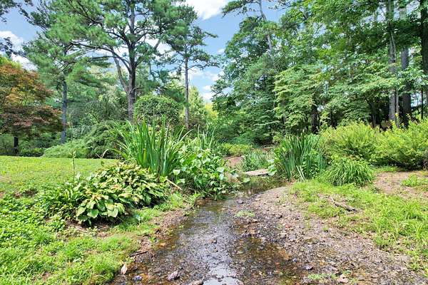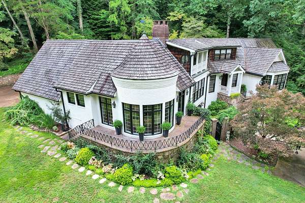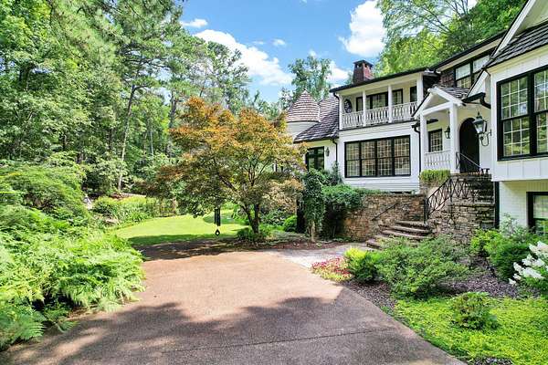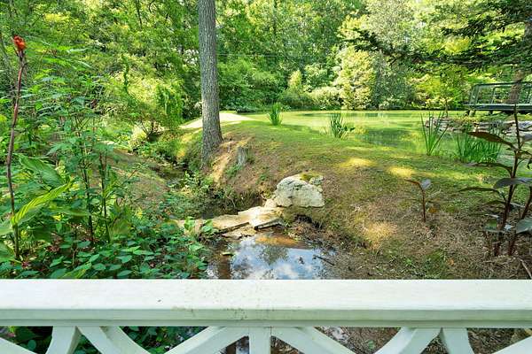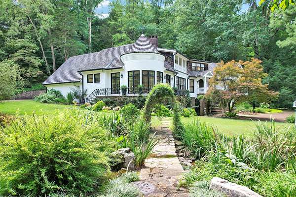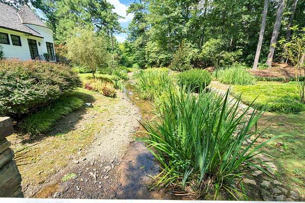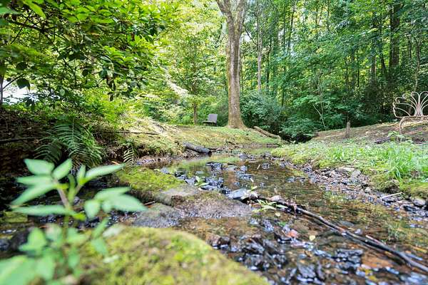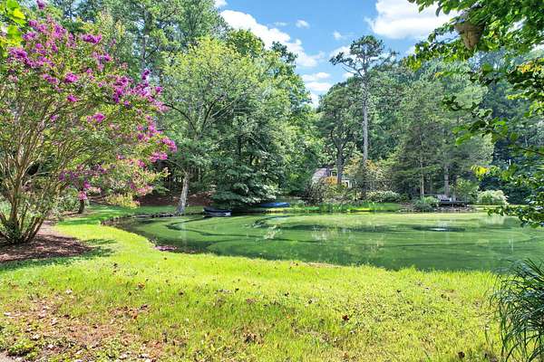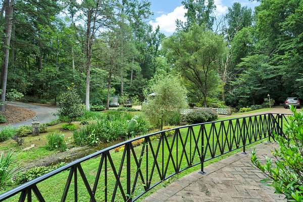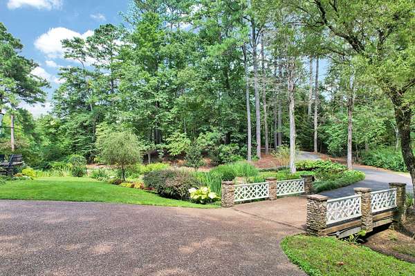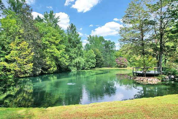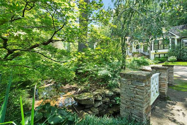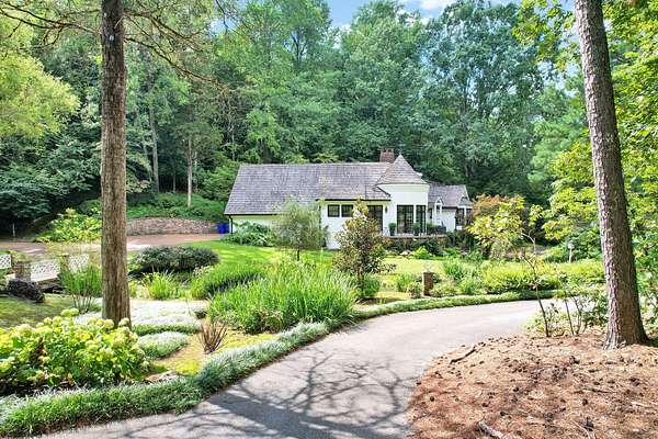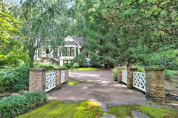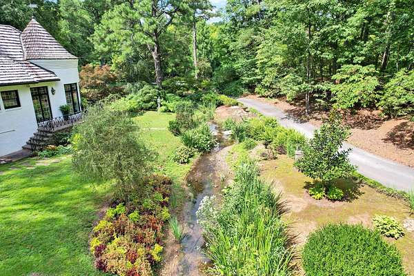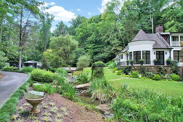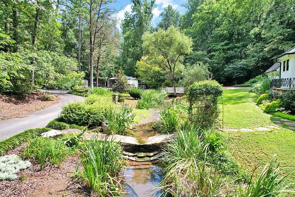 Timeless Elegance Meets Natural Beauty - Custom Estate on 5.36 Acres Designed by esteemed architect Norman Askins, this one-of-a-kind 4-bedroom, 6-bathroom estate offers 6,400 square feet of refined living space surrounded by lush, professionally landscaped grounds. Tucked away on 5.36 acres, this home blends Southern charm with architectural excellence, all framed by mature hardwoods, vibrant Japanese maples, and views that feel like your own private botanical garden. Proudly cherished by only two owners since its creation, the property has been meticulously maintained, ensuring its architectural beauty and character remain intact. From the moment you arrive, you're greeted by a storybook exterior featuring a wood shake roof, custom stone steps, and a beautifully manicured courtyard that invites relaxation and conversation. Inside, thoughtful craftsmanship abounds-coffered ceilings, granite countertops, marble and natural slab finishes in the bathrooms, and a sun-filled turret-style sunroom with all new windows. The kitchen is designed for hosting, complete with all new appliances including double ovens. Retreat to the billiard room complete with a black walnut wet bar, or unwind in the primary suite offering dual spa-like bathrooms-one includes a soaking tub, walk in shower, and heated floors for her while the other bathroom has a luxurious walk-in shower-plus the primary suite has motorized blackout blinds for restful nights. Step outdoors and immerse yourself in a true oasis. Enjoy outdoor lighting, a cascading waterfall, koi pond with fountain, garden shed, chicken coop, and two scenic, year-round creeks that flow around a private half-acre well stocked pond filled with trout and bass. Entertain on the peaceful pondside deck or relax to the sound of moving water. Whether you're entertaining guests or enjoying a quiet sunset by the water, this home offers a lifestyle of unmatched peace, luxury, and natural beauty.