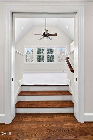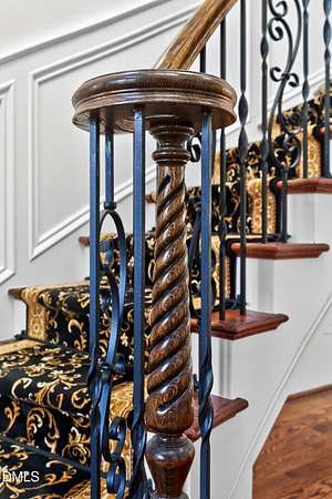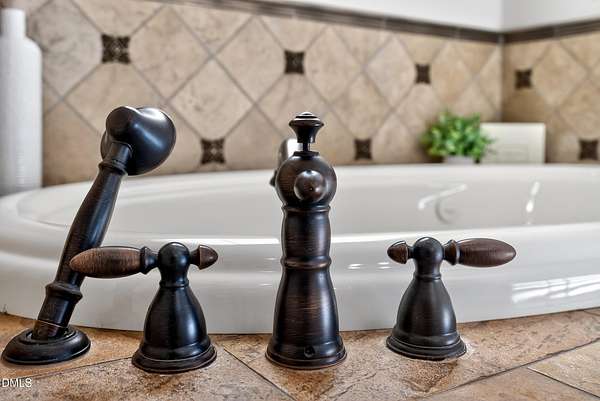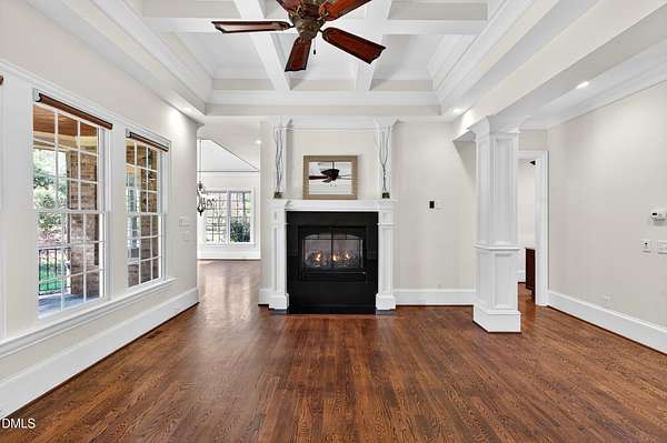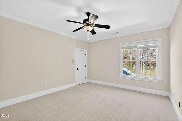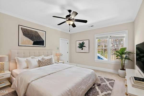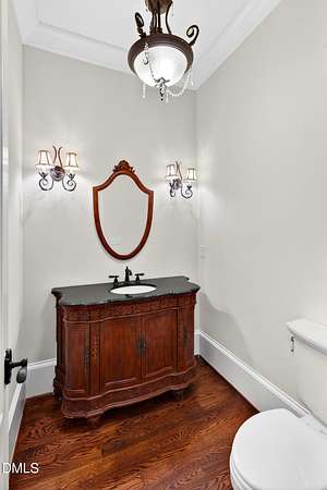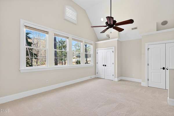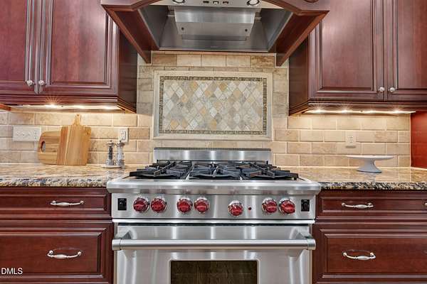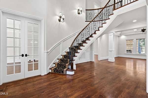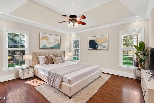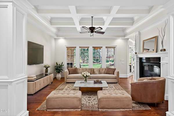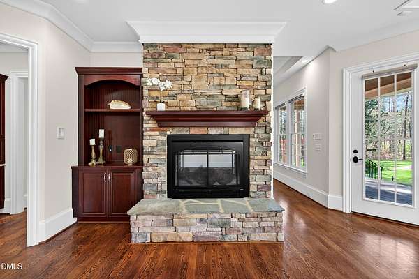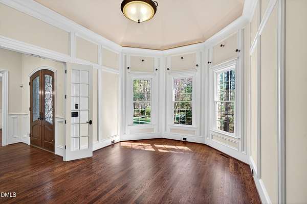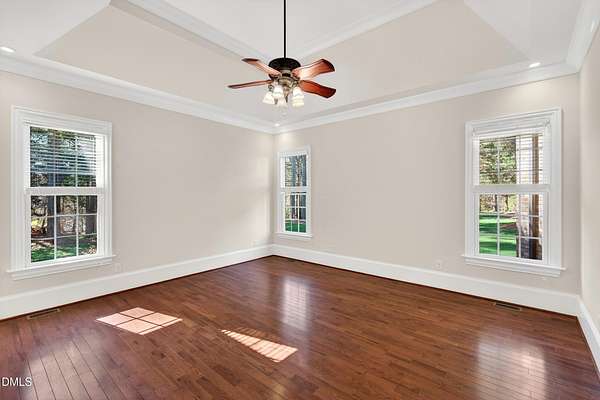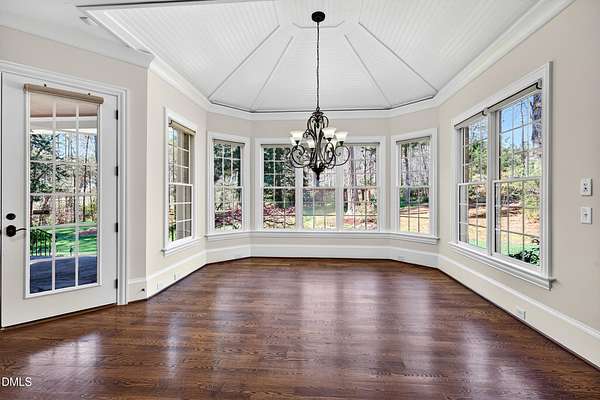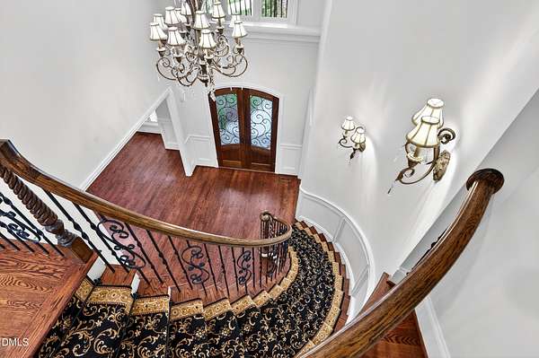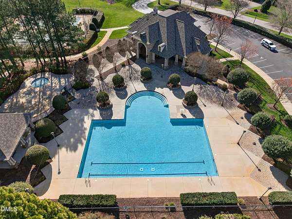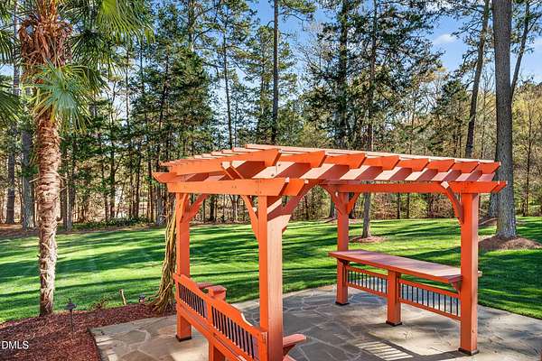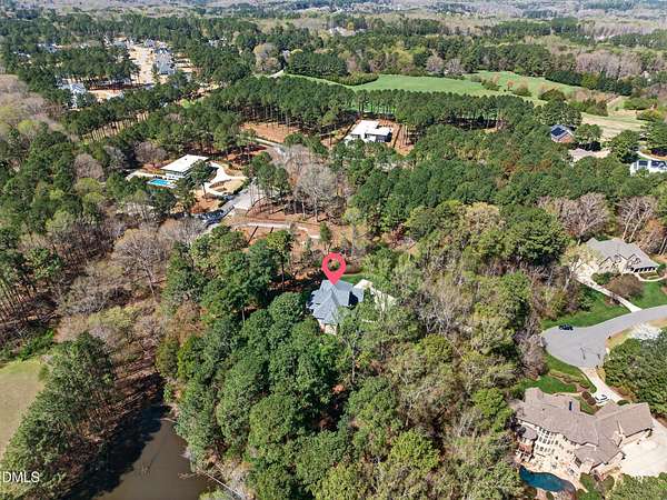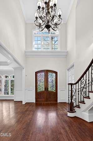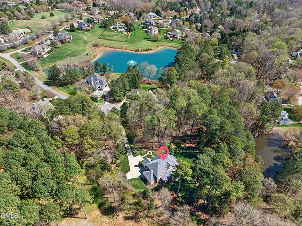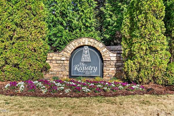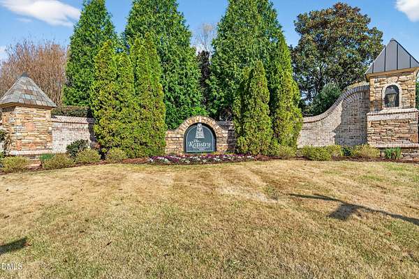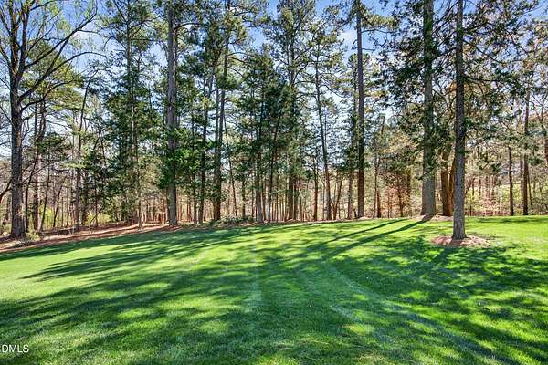 Welcome to this exceptional custom-built all-brick estate on 2.24 private acres in The Registry at Bailey Farm, one of Raleigh's premier swim and tennis communities. Offering approximately 5,350 square feet, a 3-car garage, and a secluded cul-de-sac setting with peaceful wooded views, this beautifully maintained home combines elegance, privacy, and tranquility. Dramatic two-story foyer with sweeping curved staircase. Fresh interior paint, brand-new second-floor carpet, plantation shutters, and move-in ready condition. Main level features oversized formal dining room with tray ceiling, inviting family room with coffered tray ceiling and double-sided fireplace, and chef's kitchen with 6-burner gas range, wall oven, granite countertops, cherry cabinetry, built-in refrigerator, butler's pantry, wine cellar, and bright breakfast area with adjoining sunroom. Sunny breakfast nook overlooks private wooded views. Executive office with vaulted ceiling, French doors, wall paneling, and recessed lighting. Luxurious first-floor primary suite with hardwood flooring, tray ceiling, spa-inspired bath, walk-in closets, and private washer/dryer. Upstairs offers spacious secondary bedrooms, bonus/media room with wet bar, laundry room, and unfinished walk-in storage. Expansive third-floor media/game room. Oversized covered porch with stone fireplace, pergola, grapevines, and private organic vegetable garden.
