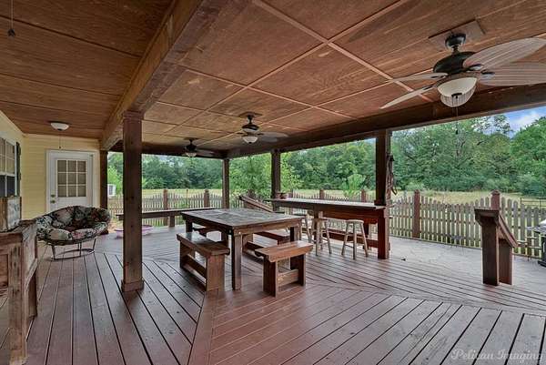 - Covered Deck, Covered Patio/Porch, Fence, Lighting, Private Yard, Stable/Barn