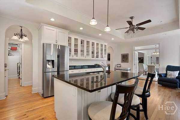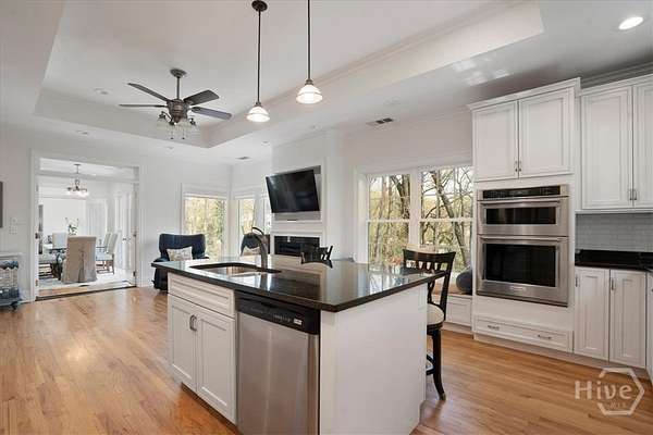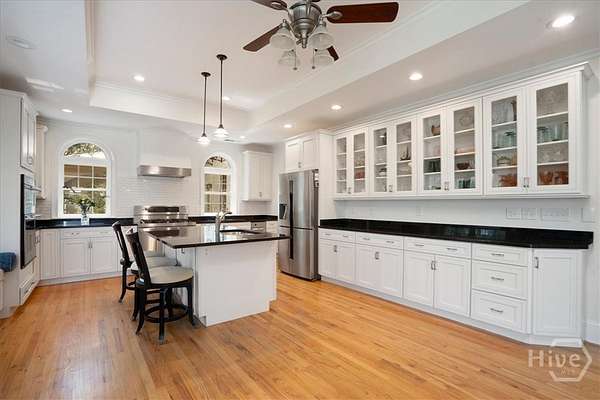 - Breakfast Area, Entrance Foyer, Gourmet Kitchen, Kitchen Island, Main Level Primary, Pantry, Primary Suite, Pull Down Attic Stairs, Recessed Lighting, Split Bedrooms, Tray Ceiling(s)