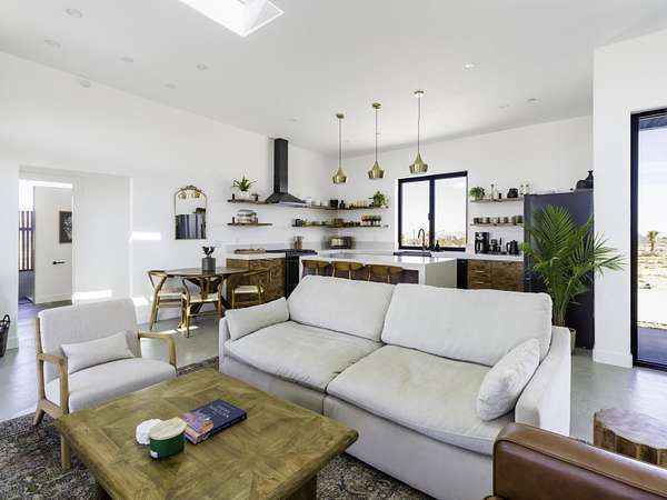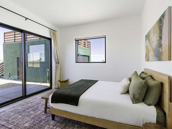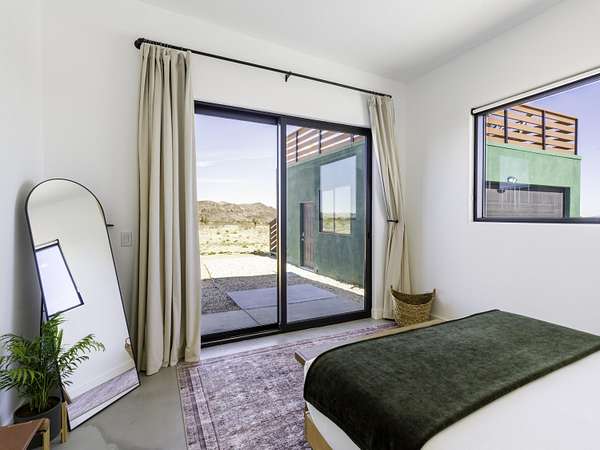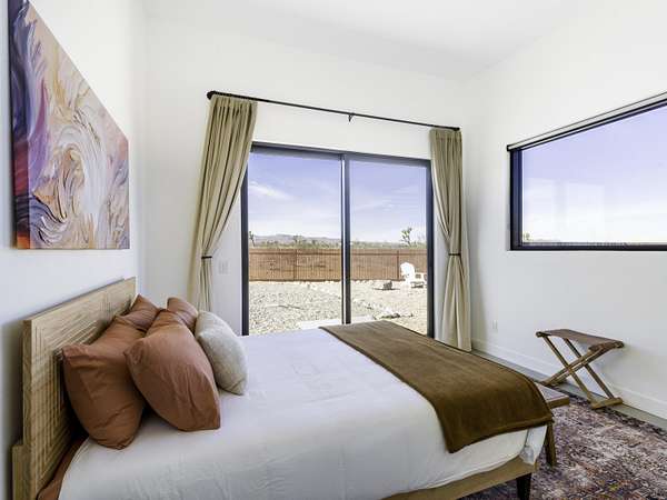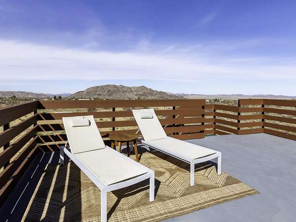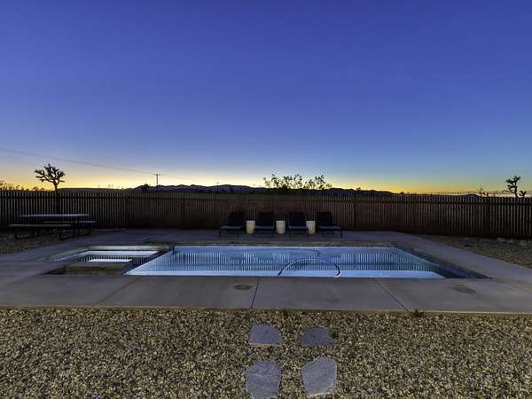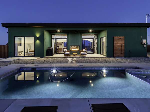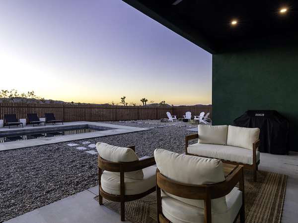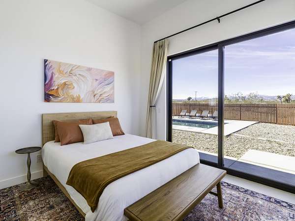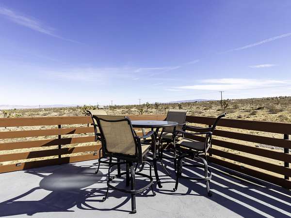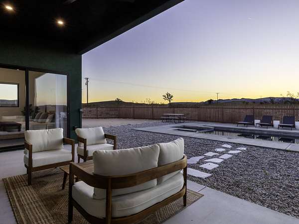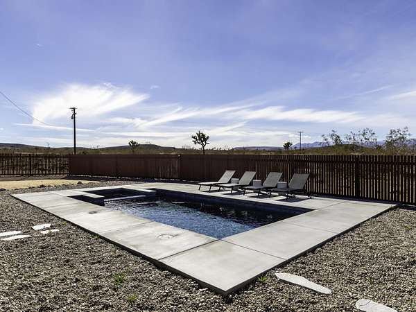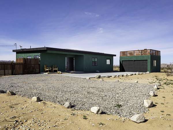 ''The G.O.A.T. at Goat Mountain offers a rare opportunity to own a private High Desert retreat set on approximately 5 acres of pristine land with sweeping views and complete seclusion--no neighboring properties, just open sky and natural beauty. This newer, architecturally refined home blends modern luxury with effortless comfort. A covered front porch opens to an elegant open-concept layout featuring a gourmet kitchen with waterfall quartz countertops, open shelving, statement lighting, and seamless flow into the family room. A striking two-sided indoor/outdoor fireplace anchors the space, while expansive custom glass pivot doors frame breathtaking desert views and enhance indoor-outdoor living. The private primary suite is a serene escape with a spa-inspired bath, soaking tub, walk-in shower, and double vanity. Two additional bedrooms are located in a separate wing and share a beautifully designed full bath. Outdoor living is elevated with a rooftop deck ideal for stargazing, a custom pool and spa, and a thoughtfully designed back porch perfect for relaxing or entertaining. Property features include fully owned solar, EV chargers, and a cement pad intended for a future tiny home addition, located on the rear of the property with water already run and easy connection to existing septic and power. Under San Bernardino County zoning, this nearly 5-acre property allows for expansion and qualifies for two short-term rental permits. The home is currently an active, successful short-term rental, offering both lifestyle and income potential. A rare blend of privacy, luxury, and opportunity--this is more than a home, it's a destination.''