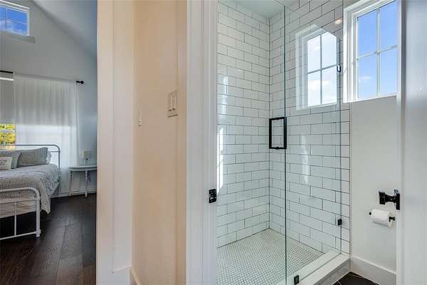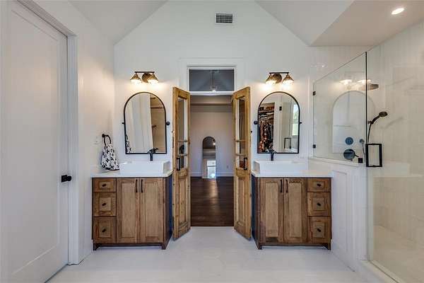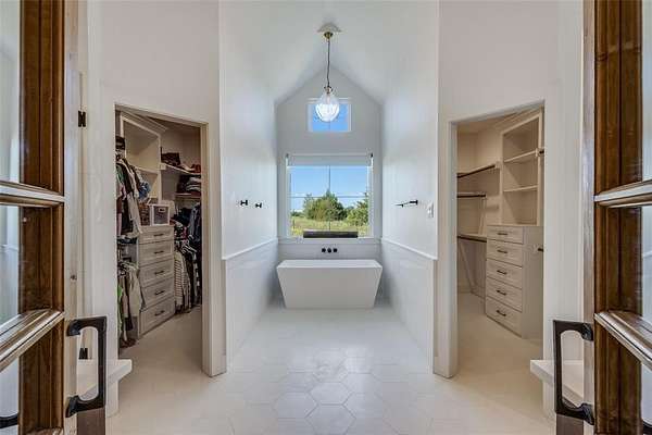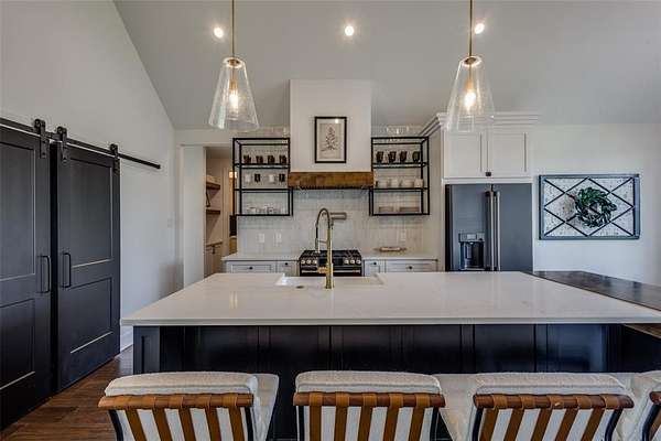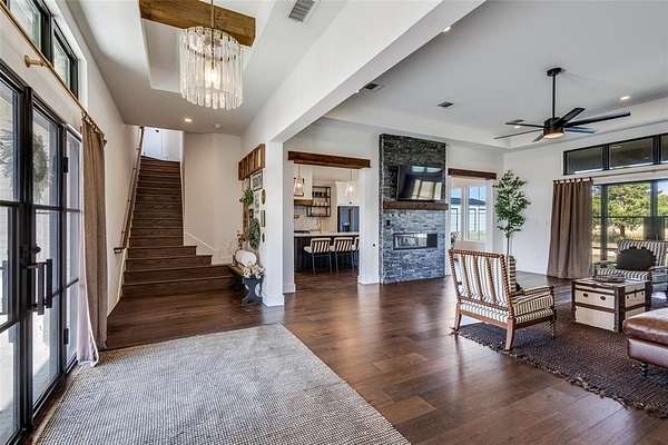 The spacious, open-concept kitchen is a chef's dream with GE Cafe gas stove and oven, quartz countertops, a farmhouse sink, and a double-sided fireplace shared between the kitchen and living room- perfect for cozy gatherings and entertaining. The home features stunning vaulted ceilings with rich wooden beams in the entryway, kitchen, and living room, creating a spacious atmosphere. The primary suite offers serene acreage views, a shiplap ceiling, and a spa-inspired en suite bath with a luxury soaking tub, and his-and-hers walk-in closets.