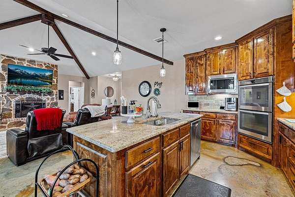 - Decorative Lighting, Eat-In Kitchen, Flat Screen Wiring, Granite Counters, High Speed Internet Available, Kitchen Island, Open Floorplan, Pantry, Second Primary Bedroom, Vaulted Ceiling(s), Walk-In Closet(s)