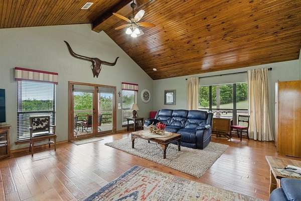 Discover this stunning 3-bedroom, 2-bath home nestled on over 2 private and partially wooded acres in the heart of Hill Country's scenic Mountain Lakes. With a massive walk-out basement, oversized 2-car garage and additional large detached insulated workshop, this property offers the space and flexibility you've been searching for. Inside, you'll find an expansive open-concept layout, anchored by a soaring 17-foot cathedral pine ceiling, cozy wood-burning fireplace with log scuttle and panoramic views that flood the oversized living room with natural light. Step out onto the Trex partial wraparound deck and take in the peaceful backyard and rolling terrain -- your own private slice of paradise. The spacious kitchen features: granite countertops, abundant custom pine cabinetry, island with seating, walk-in pantry & utility room with workspace, desk, and additional storage. The primary suite is your personal retreat, with a private deck entrance, and windows to enjoy the view, jetted garden tub, walk-in shower for two, dual vanities, and a relaxing sitting area and huge custom closet. Guest bedrooms share a dual-entry bathroom with two vanities, a tub, and a shower -- perfect for family or visitors. Outside, your dream workshop awaits: Insulated 31x31 building that matches the home, attic space, water outside door, 2 double 16' garage doors and potential for additional living space or home office.