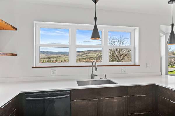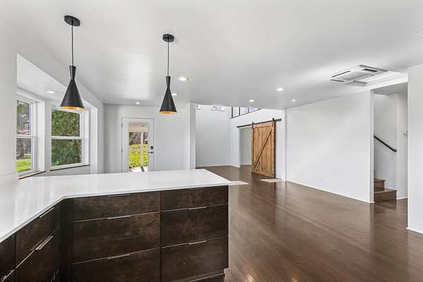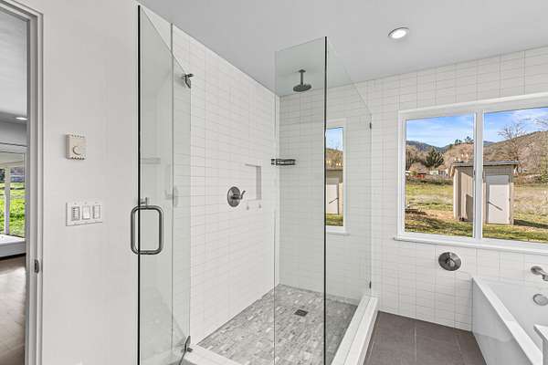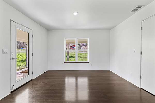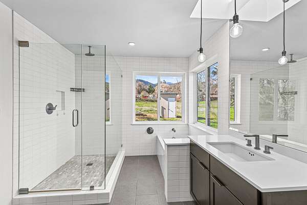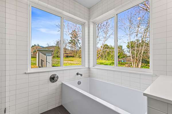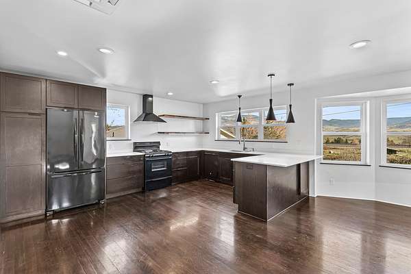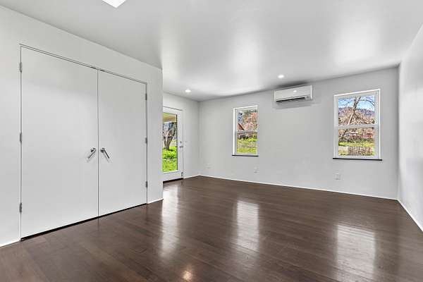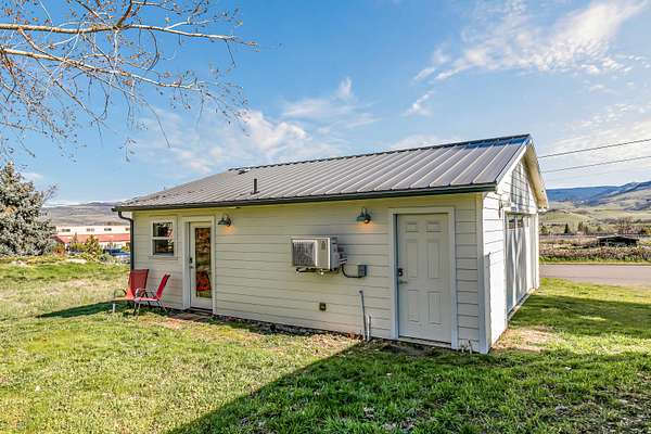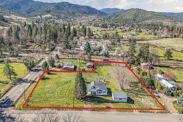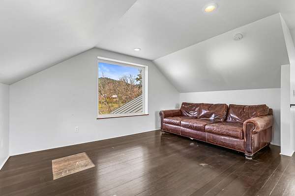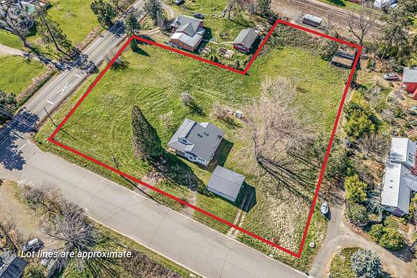 Fully renovated home by Coleman Creek Construction with detached studio and garage on rare E-1 zoned acreage with development potential in city limits! Charming front porch and covered wrap-around patio, open-concept living area with double-height vaulted ceiling, kitchen with quartz dining counter, designer lighting, and stainless appliances including gas range oven. Main-level primary suite with skylights, glass door to back patio with retractable awning, and full ensuite bathroom with quartz vanity, deep soaking tub, and oversized shower with seamless glass and tile surround. Additional main-level bedroom and full guest bathroom with quartz vanity, stacked washer dryer, and tiled shower. Vaulted upper-level media room, office, or third bedroom. Detached studio with quartz dining counter, stainless appliances including electric range oven, full bathroom with quartz vanity, tub shower, washer dryer, plus two-car garage. Ample off-street boat or RV parking. Inquire for details!