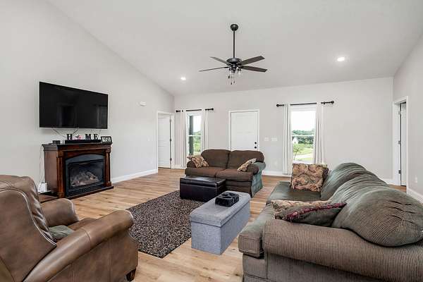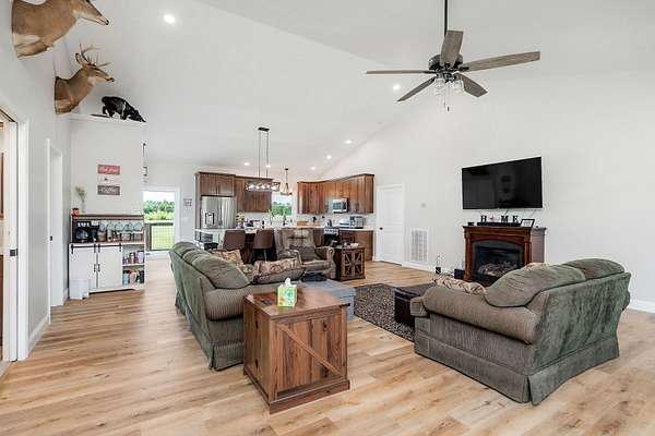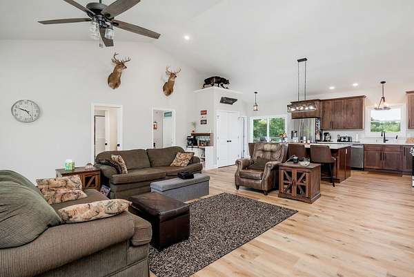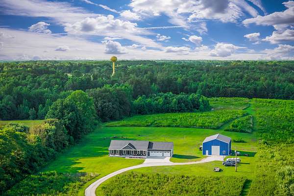 Spacious 4-BD (3BD septic), 3 BA on 32 Scenic Acres - A Hunter & Fisherman's Paradise. Nestled on 32 acres, this home offers the perfect blend of comfort, privacy, and outdoor adventure. Peaceful country lifestyle or a recreational haven, this property has it all. A thoughtfully designed home with cathedral ceiling/open great room/kitchen featuring quartz countertops & 8.5x5.25' eat-in island. Mstr suite has large tile shower, all bathrooms have cozy heated floors. The spacious, open layout is perfect for family living and entertaining. The full basement offers plenty of additional space for storage, hobbies, or future finishing & provides a 6x54 SAFE room. Mature woods ideal for hunting, & stocked bluegill, bass, & catfish pond ready for fishing. A 60x40 pole barn w/ample room for equip or workshop space, featuring 18 foot side walls, 14' RV door, & 200 amp service. The attached oversized 3 car attached garage adds everyday convenience. This one-of-a-kind property is a rare find!