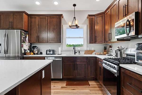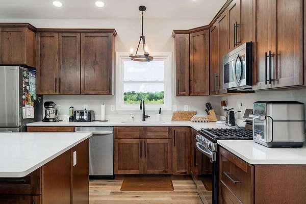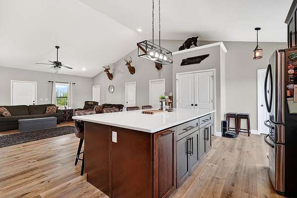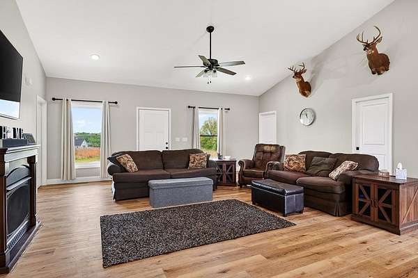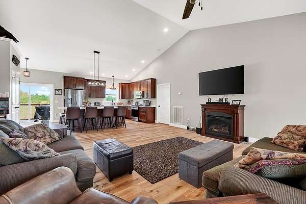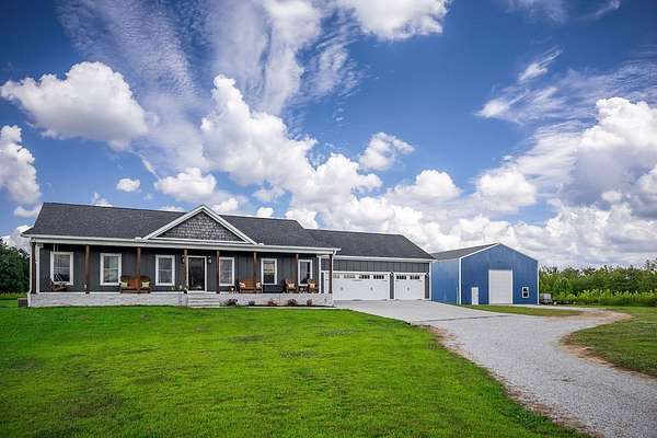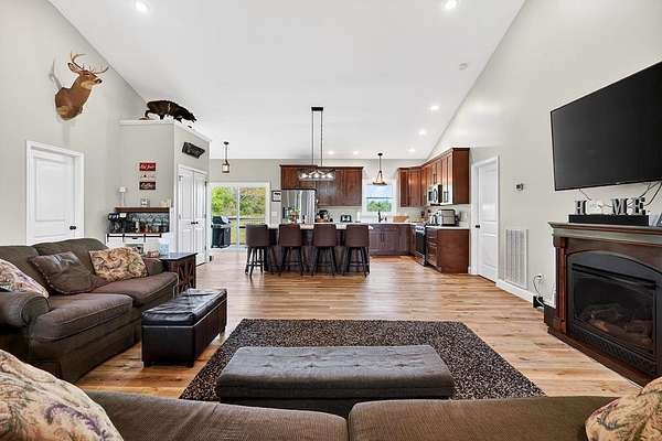 Spacious 4-BD (3BD septic), 3 BA on 32 Scenic Acres - A Hunter & Fisherman's Paradise. Nestled on 32 acres, this home offers the perfect blend of comfort, privacy, and outdoor adventure. Peaceful country lifestyle or a recreational haven. A thoughtfully designed home with cathedral ceiling/open great room/kitchen featuring quartz countertops & 8.5x5.25' eat-in island. Mstr suite has large tile shower, all bathrooms have cozy heated floors. The spacious, open layout is perfect for family living and entertaining. The home also has a hot tub. The full basement offers addt'l space for storage, hobbies, or future finishing & provides a 6x54 SAFE room. Mature woods ideal for hunting, & stocked bluegill, bass, & catfish pond ready for fishing. A 60x40 pole barn w/ample room for equip or workshop space, featuring 18 foot side walls, 14' RV door, & 200 amp service. The attached oversized 3 car attached garage adds everyday convenience. This one-of-a-kind property is a rare find!