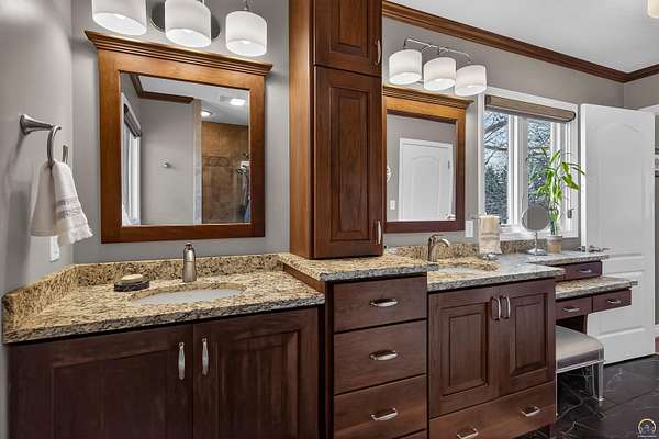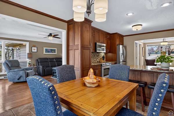 Seclusion and convenience in Washburn Rural School District and the Wanamaker corridor, this amazing home is on mowed and maintained park like acreage. Great layout and flow, the home is main-floor living with the laundry adjacent to the primary and full ensuite bath with double sinks. Walk the living room with all the windows into the huge eat-in kitchen with tons of cabinet storage and granite, past the sitting area and into the family hearth room. Upstairs you find two more large bedrooms, extra storage, and another full bath. The finished basement finds plenty of space for entertaining with wet bar, the 4th bedroom ensuite with full bath, and extra closets and storage for all of your goodies. Continue the party on the spacious decks and patios surrounding the house and into the yard with the fire pits already go for you! Plenty of space in the oversized 3 car garage for hobby's, yard tools and extra things. All the windows you need to view the private acreage, all the extra closets and storage, better get to packing in order to figure out where you'll want your stuff!