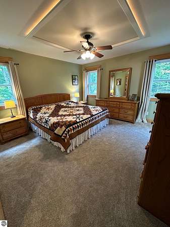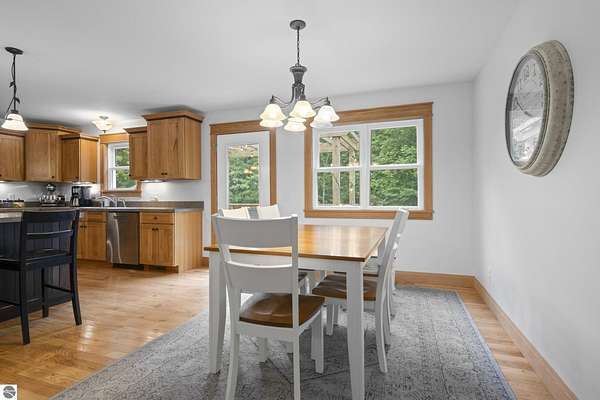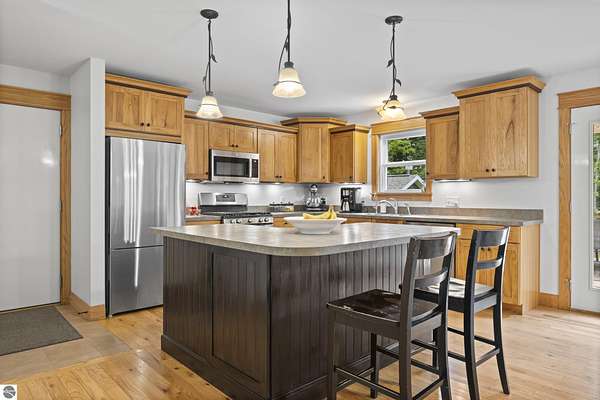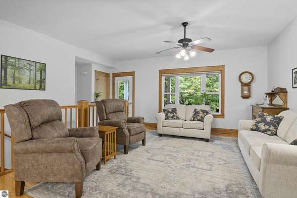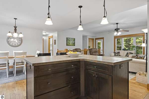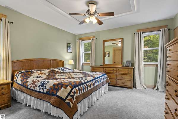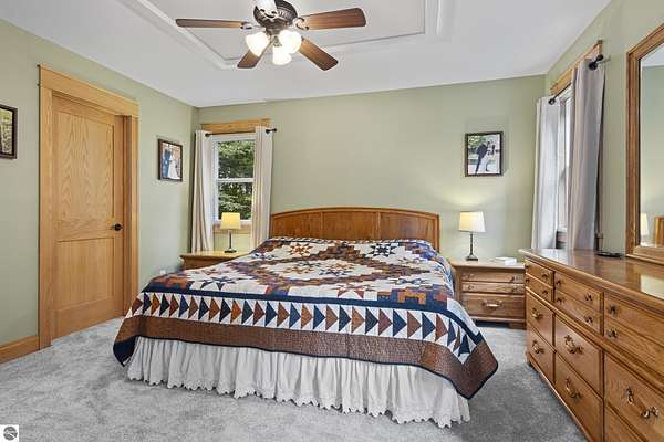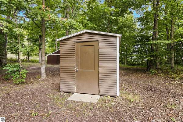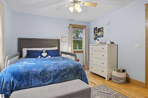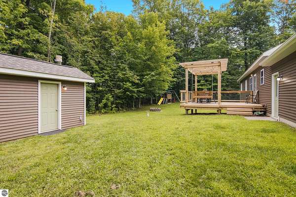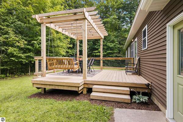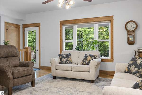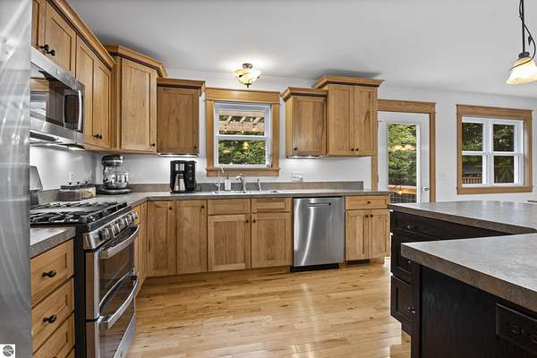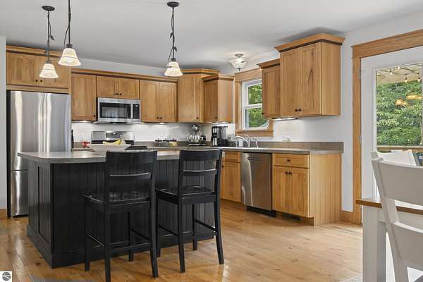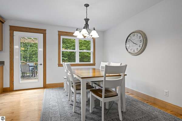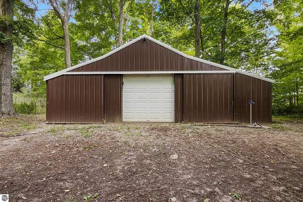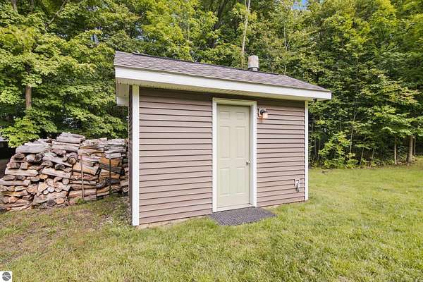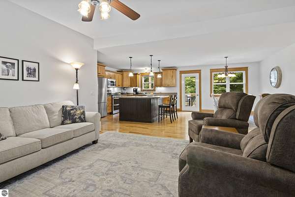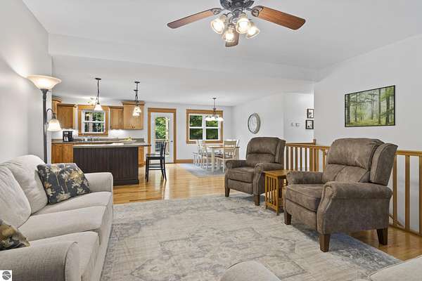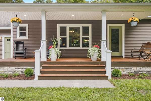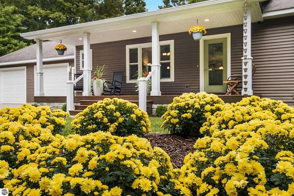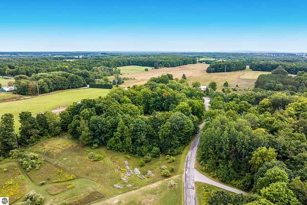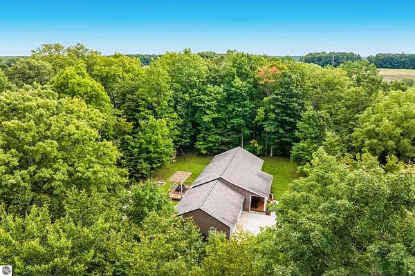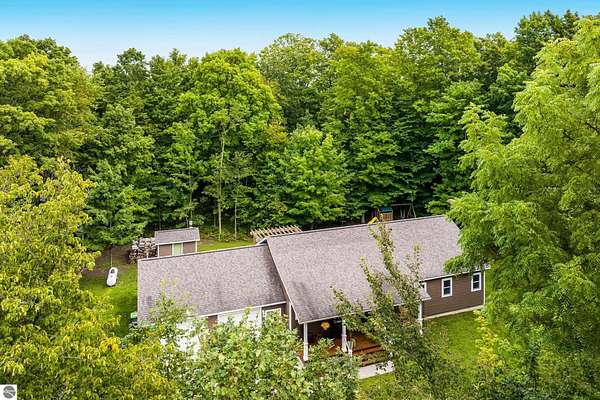 Beautifully crafted 4 BR/3.5 Bath RANCH tucked into nearly 6 wooded acres. Main floor conveniences & a fabulous finished lower level. Open island kitchen features handcrafted solid wood cabinetry & new appliances. Solid wood floors, custom created woodwork, trim & finishes. Lrg MBR suite. Main flr laundry rm + mudrm. High speed fiber optic internet is perfect for home offices. Attached oversized garage, 220V elect, insulated, heated & water. Super dual heating systems; exterior 2019 wood boiler + Acheiver 90+ forced air furnace, Kinetico water filtration system. Swing on your welcoming front porch + a large composite back deck, pergola & bonfire site perfect for gatherings. AND barn & outbuildings. Private paved rd; small neighborhood of acreage parcel homes. Located min.s to Interlochen Center for the Arts, 20 min.s to TC & Crystal MT Resort, 10 min.s to Chums Corners.