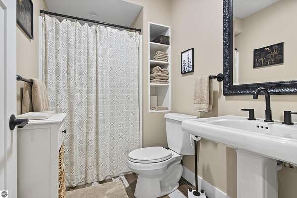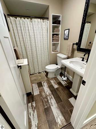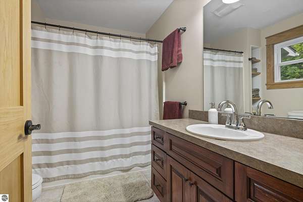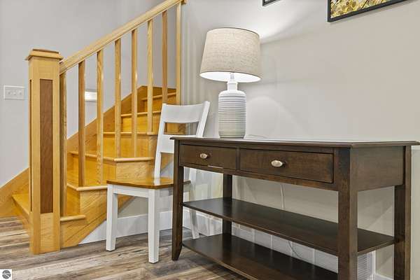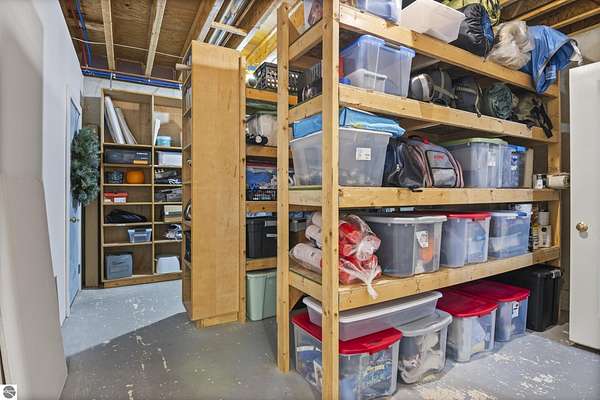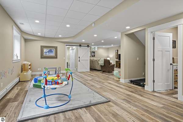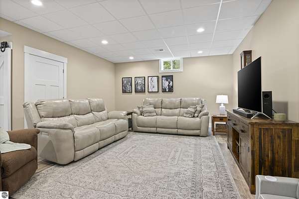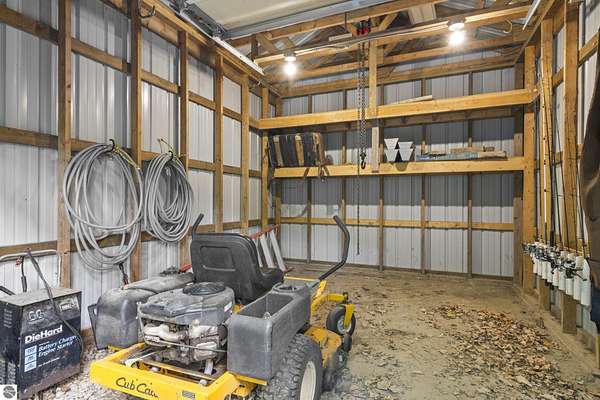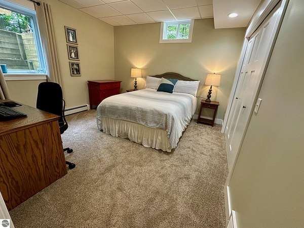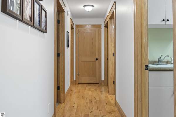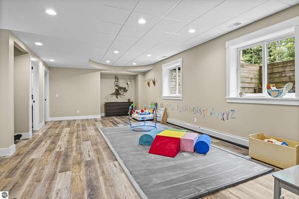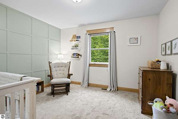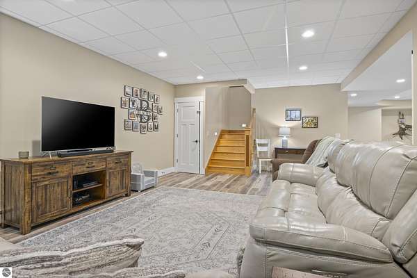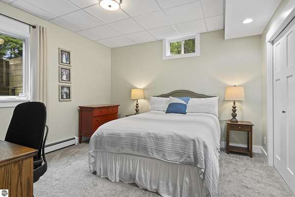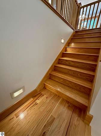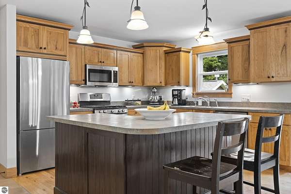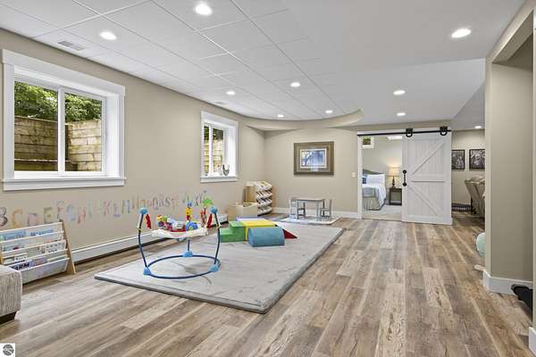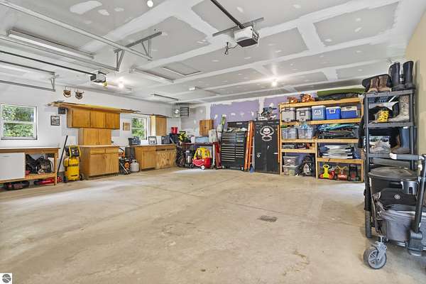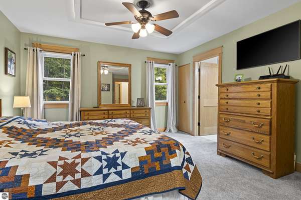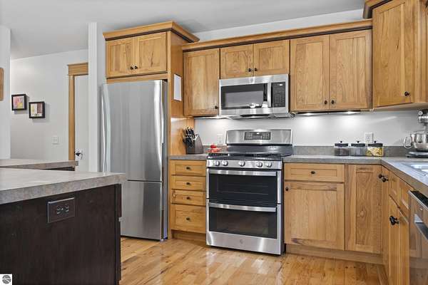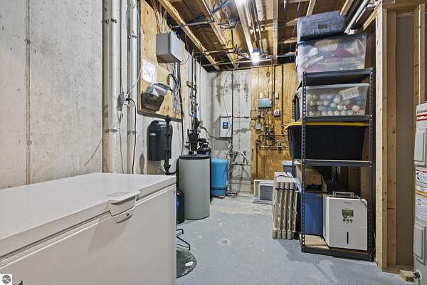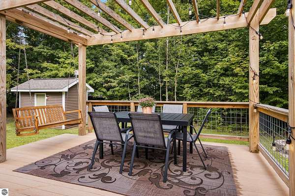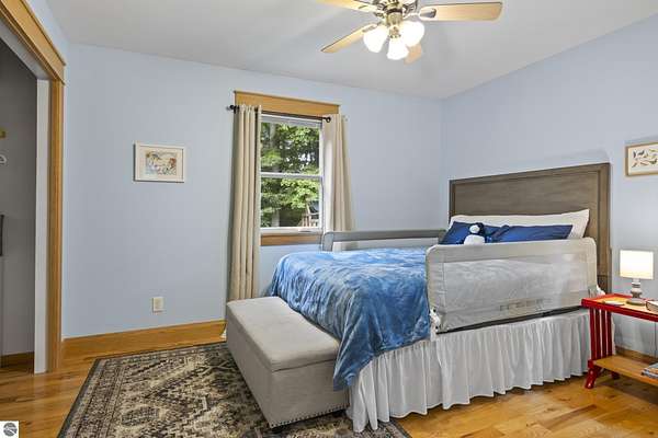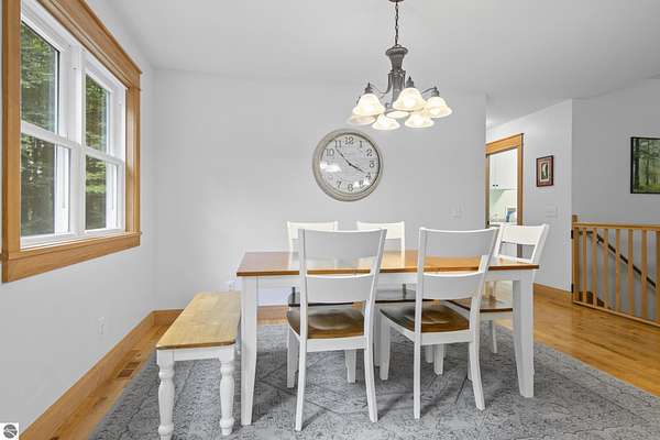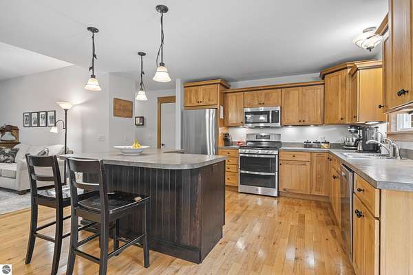 Beautifully crafted 4 BR/3.5 Bath RANCH tucked into nearly 6 wooded acres. Main floor conveniences & a fabulous finished lower level. Open island kitchen features handcrafted solid wood cabinetry & new appliances. Solid wood floors, custom created woodwork, trim & finishes. Lrg MBR suite. Main flr laundry rm + mudrm. High speed fiber optic internet is perfect for home offices. Attached oversized garage, 220V elect, insulated, heated & water. Super dual heating systems; exterior 2019 wood boiler + Acheiver 90+ forced air furnace, Kinetico water filtration system. Swing on your welcoming front porch + a large composite back deck, pergola & bonfire site perfect for gatherings. AND barn & outbuildings. Private paved rd; small neighborhood of acreage parcel homes. Located min.s to Interlochen Center for the Arts, 20 min.s to TC & Crystal MT Resort, 10 min.s to Chums Corners.