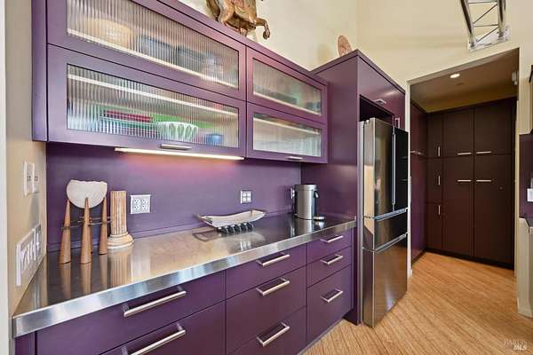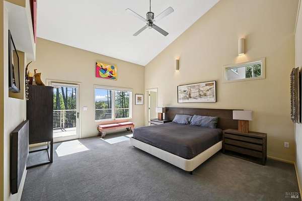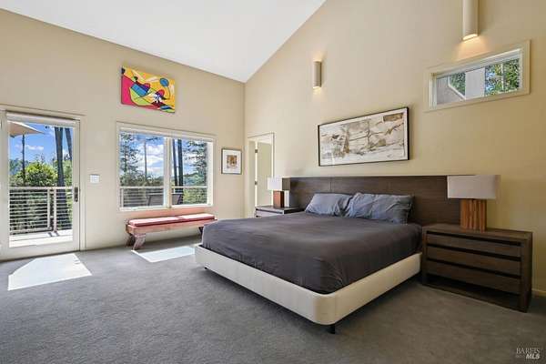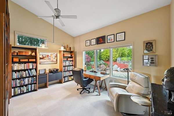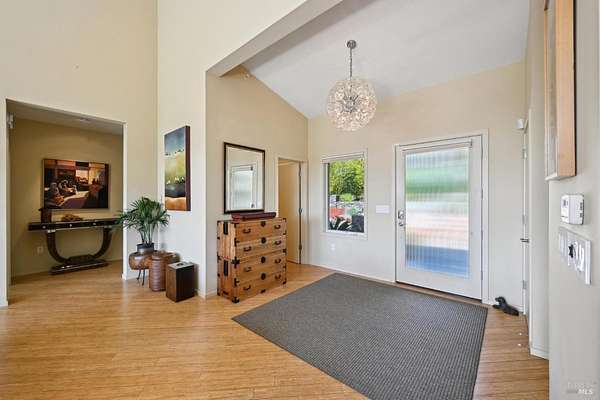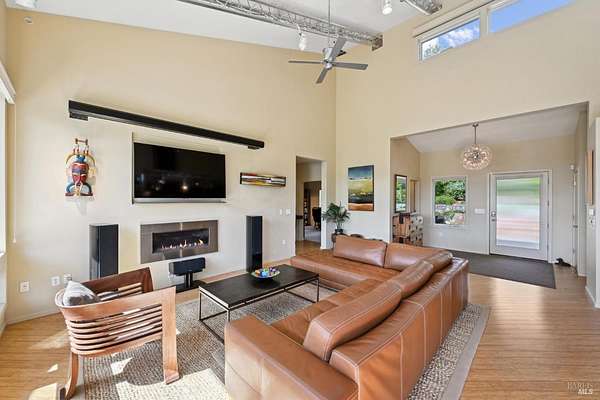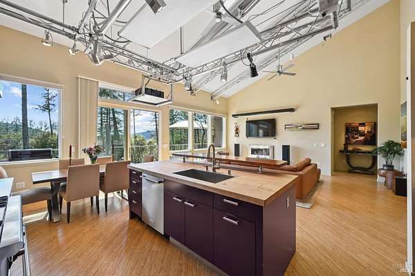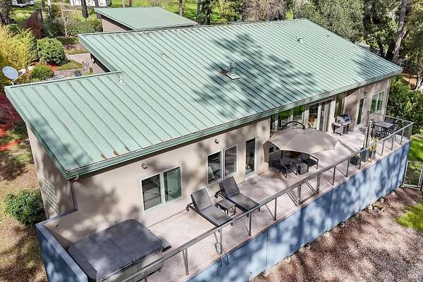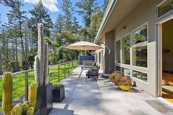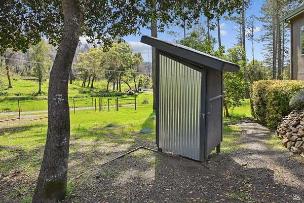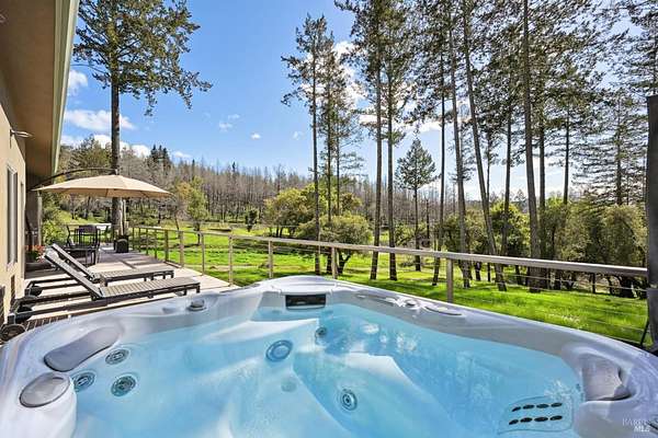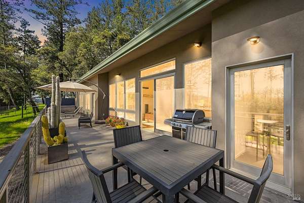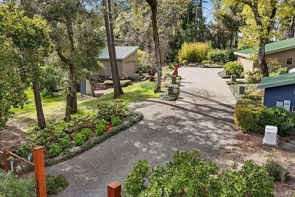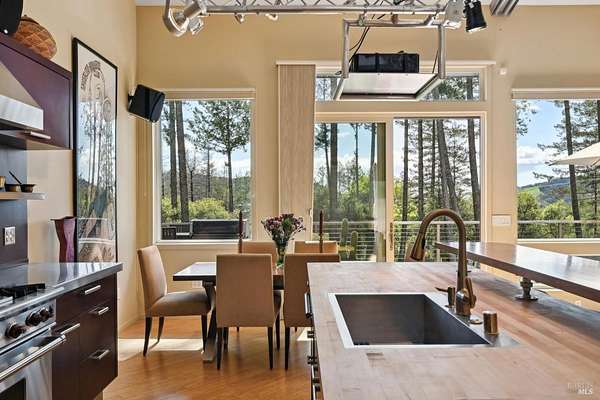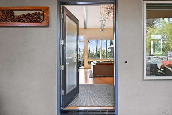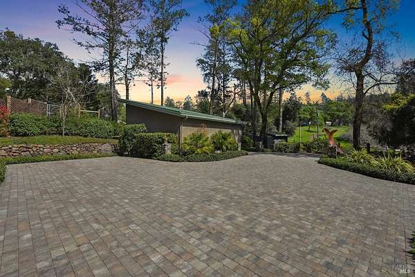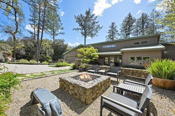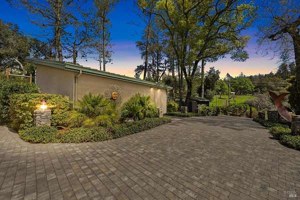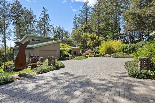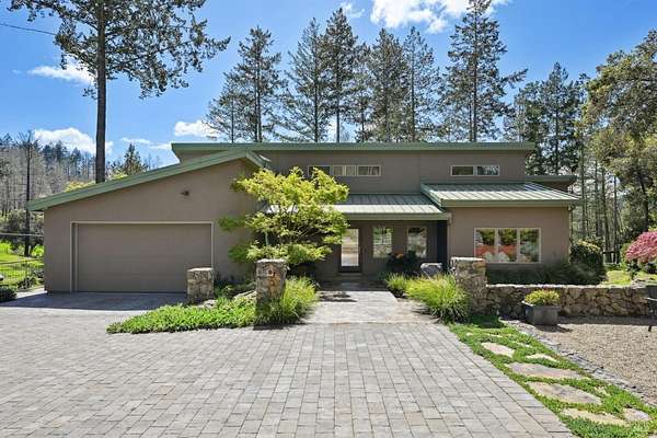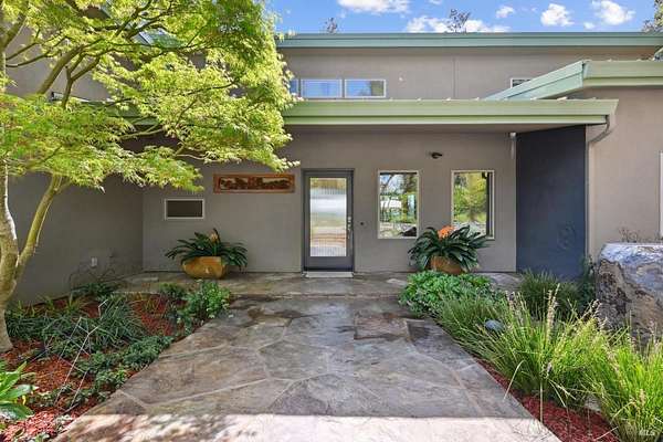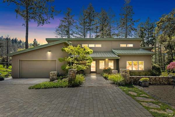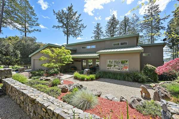 On a serene 1.8-acre parcel in the gorgeous hills above Santa Rosa rests this modern home with detached shop only 10 minutes from town! Quality of construction is felt throughout! With an abundance of natural light, this open & spacious home features 2 primary bedroom suites and an office with view of the wonderful garden. This home is solid and fire-resilient, featuring a metal roof, steel trusses, soaring ceilings and clerestories from which the light just pours in. The gourmet chef's kitchen is a culinary haven, featuring butcher block & stainless countertops and a 5-burner Wolf stove. The living room opens up to the spacious deck with gorgeous views of the surrounding hills and trees. Rich bamboo flooring and radiant floor heating throughout add a touch of warmth and elegance. Also featured are a circulating hot water, central vacuum system, and security system. This sunny and private lot has a huge beautifully paved driveway behind an automatic gate. Wonderfully landscaped garden with spacious seating area, outdoor firepit, and soothing water feature. A 748 sqft detached shop with loft are ready for any of your hobbies. Nestled in the heart of Wine Country, this home offers the serenity of the countryside while being just 10 minutes from shopping, dining, and conveniences.