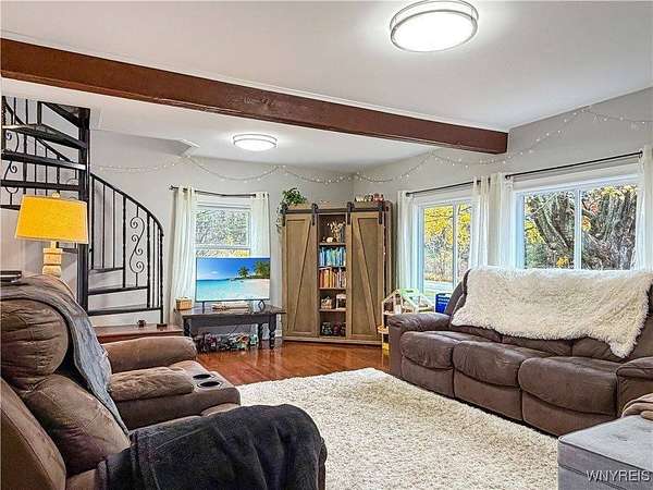 Stunning updated home on 3.29 acres in Letchworth School District and minutes from Letchworth state park!Come check out this 2 bed 1 bath house. The back entry leads to a room that could be a playroom, office or seperate dining space... your choice! The main living space offers a 1st floor laundry, spa like bathroom and cozy living room. The kitchen has lovely corian countertops, farmhouse sink, gorgeous white cabinets, double wall ovens and a spacious island big enough to eat at. The unique spiral staircase leads up 2 bedrooms with tall ceilings (bonus! one of the bedrooms has a juliet balcony). Could be used as a rental or even Airbnb it! The yard is peaceful and spacious...perfect for any activity! Store those fun outdoor toys in the detached 1 car garage. Better yet, its insulated so add a heat source and you'll have a year round workshop! Don't wait, come see it today!