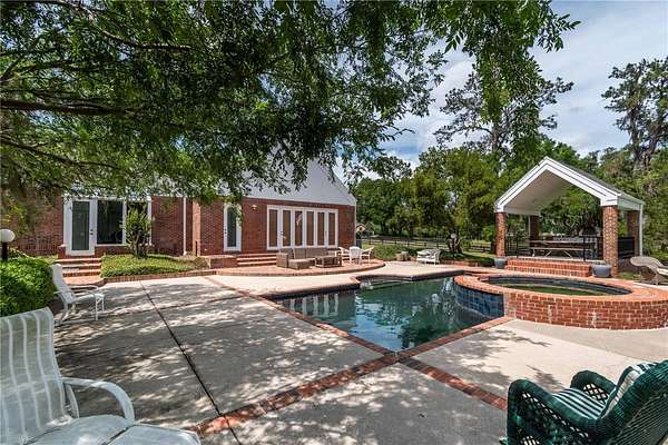 Central Florida bliss! The home is an immediate eye-catcher with mature landscaping, a circular driveway, an attached 3-car side entry garage, and a park-like setting. Fully customized, the home offers a total of 3- bedrooms and 4-baths with nearly 6,000 sq.ft. of space. The interiors showcase abundant natural light, soaring cathedral ceilings, and stunning views of the outdoors throughout the home thanks to huge picture windows that allow the greenery outside of the home to become a feature inside. The formal living area is nicely open, with huge windows and french doors that open to the outdoors and a large brick-facade fireplace. Filled with decorative accents, the kitchen is well-appointed and includes a large breakfast bar, adjacent breakfast are with a view to the pool area, and additional pantry. There are many memorable features and spaces throughout including a large professional office, formal dining area, a rock-garden, a huge entertainment space with built-in wet bar and pool table, and built-in sound system. All bedrooms are well appointed, but the master suite is particularly notable with an extra-large layout, a floor-to-ceiling fireplace, private garden tub, huge walk-in closet, and private en-suite with dual sinks, ample counter space, built-in vanity, and walk-in shower. To the back of the home is a true Florida oasis that features a sparkling in-ground saltwater pool and spa, an expansive concrete pool deck, multiple brick patios with ample space for entertaining, and a large covered area with built-in grill. This unique property is wonderfully maintained and beautifully partially furnished if desired, making move-in a breeze. The community is highly convenient to a variety of shopping, dining, entertainment, and medical options available just a short drive away. Rent includes grounds care and pool maintenance. Pets are allowed with $500 pet deposit. Lease available from