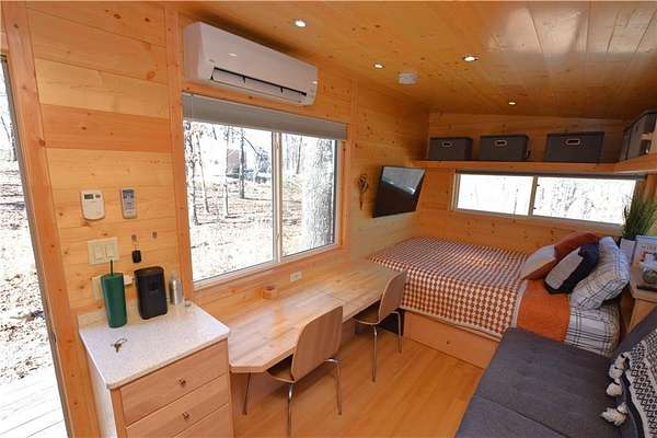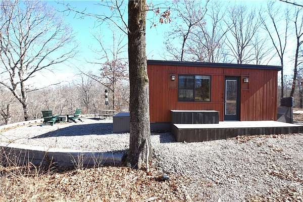 Are you ready for your getaway destination? This newer tiny home, built in 2022, offers 220 sq ft (per CH) of thoughtfully designed living space and sits on 2.8 acres m/l. The home is connected to septic and rural water, making it move-in or rental ready. Located within 1 mile of the Illinois River Ranch, this property is perfectly positioned for outdoor recreation and relaxation. A concrete block retaining wall surrounds the home, and the large gravel patio at the rear features a fire pit where you can take in the stunning mountain views. Inside, you'll find an open floor plan combining the dining, living, kitchen, and bedroom space along with a private bath, mini-split heating and cooling, cozy pine wood accents, and furnishings that convey--making this a turnkey setup. OzarksGo internet is available, and the quiet setting offers excellent hunting and privacy. Whether you're looking for a personal escape or a profitable VRBO investment, this cozy retreat checks all the boxes.