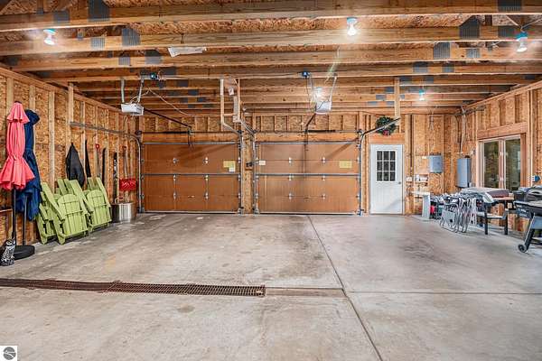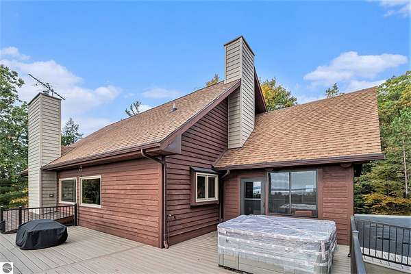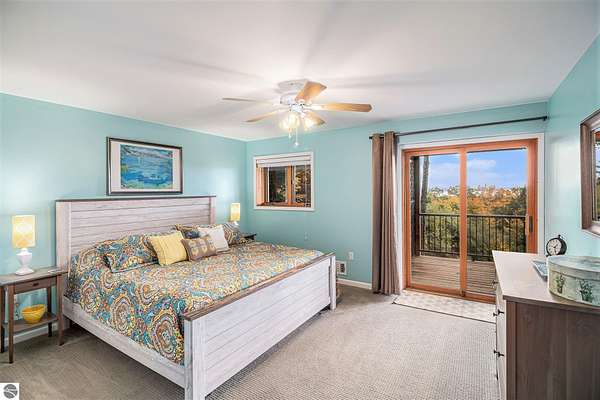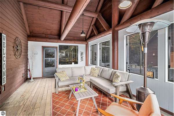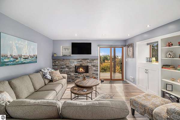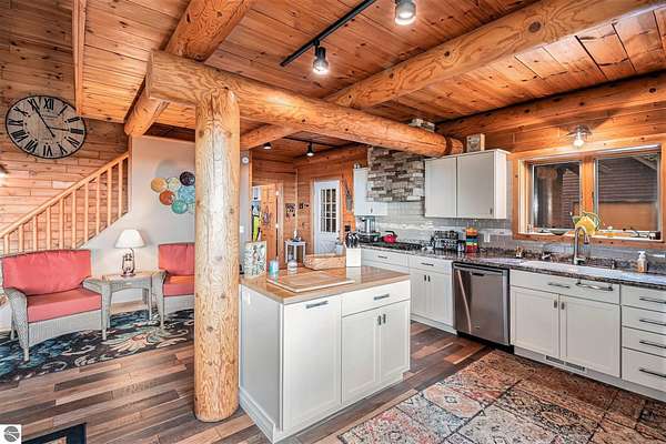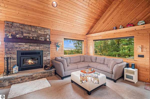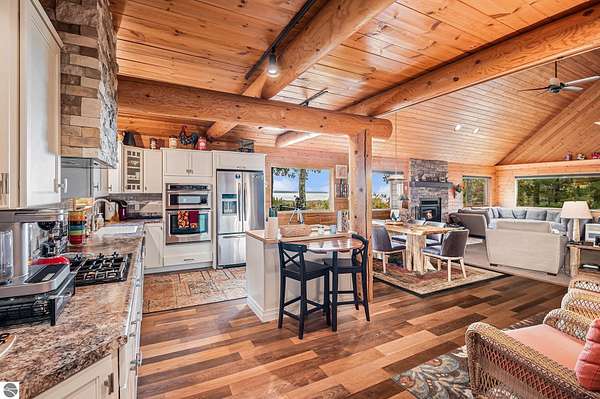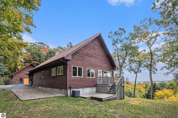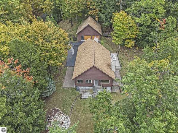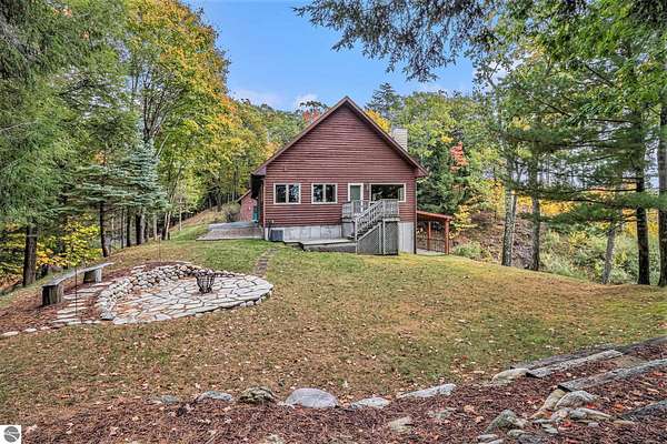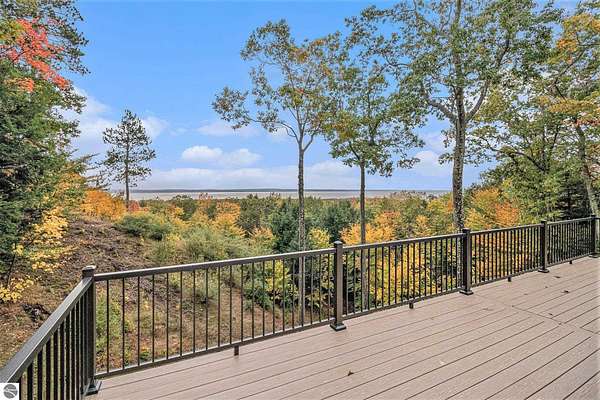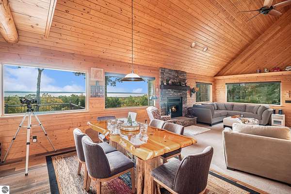 Enjoy breathtaking views of Lake Michigan from this stunning 3-bedroom, 3-bath home that perfectly blends warmth, character, and comfort. Rich wood accents and striking wood-beam ceilings create a timeless and inviting atmosphere throughout the open-concept living spaces. The living room features a beautiful fireplace framed by large windows that flood the home with natural light and capture the serene lake and wooded views. The kitchen is a chef's dream, showcasing granite countertops, stainless steel appliances, and plenty of space for entertaining. A spacious 3-season porch extends your living area, perfect for morning coffee or evening sunsets overlooking the water. The finished walk-out basement offers even more room to relax or host guests, complete with a cozy fireplace and a full wet bar. Step outside to the expansive deck, patio, or fire pit area surrounded by mature trees--ideal for outdoor gatherings or peaceful evenings by the lake. The large primary suite is a private retreat with a spa-like bath featuring an open walk-in shower and granite vanity. Additional highlights include a charming loft bedroom and a large detached garage with abundant storage.