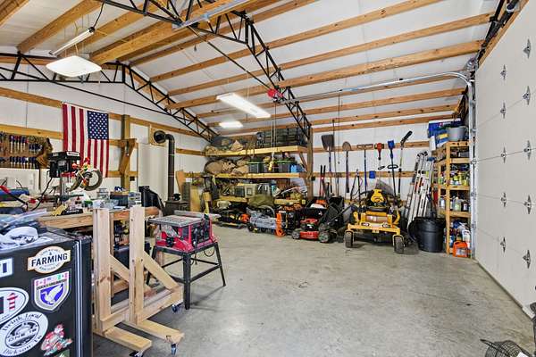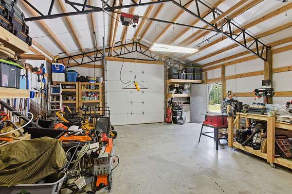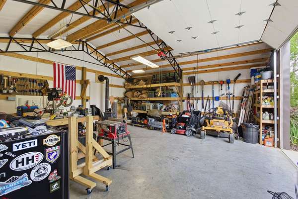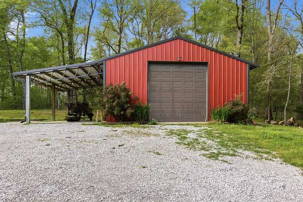 - Detached, Garage Door Opener, Garage Faces Side, Gravel