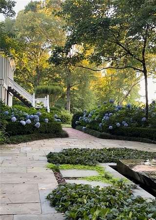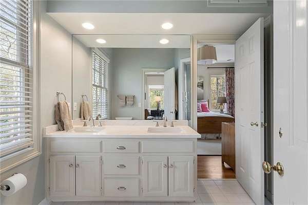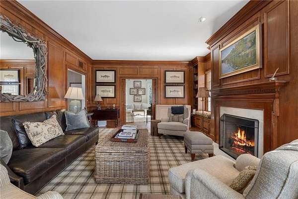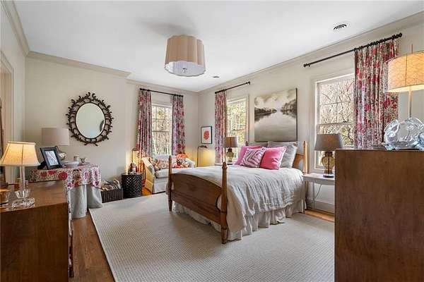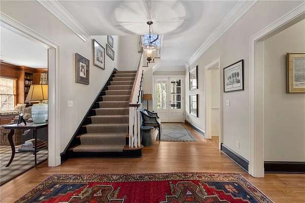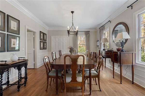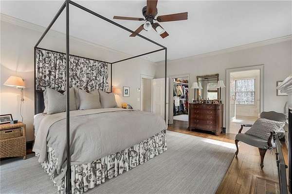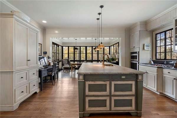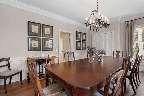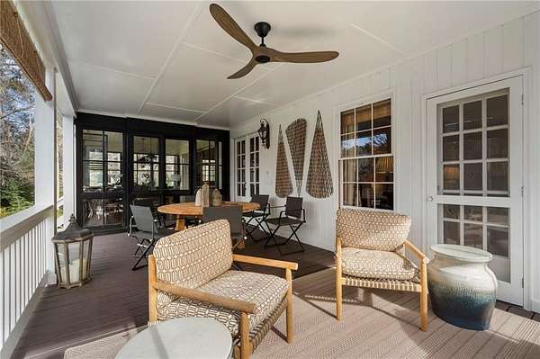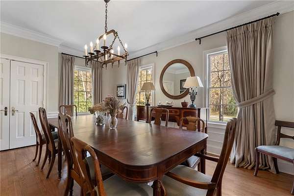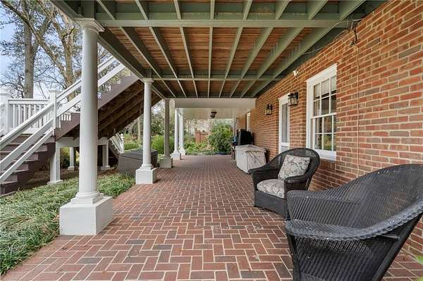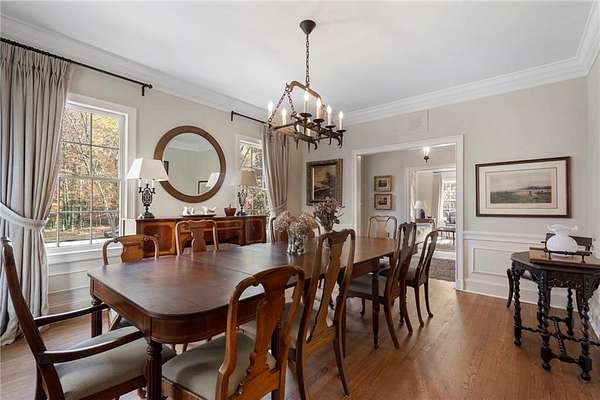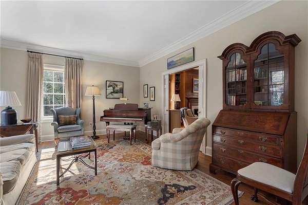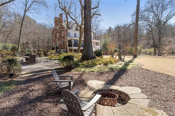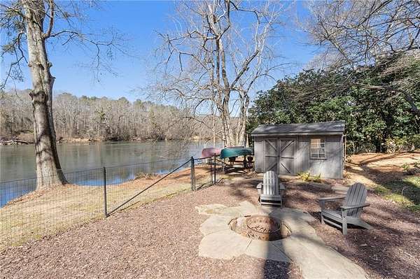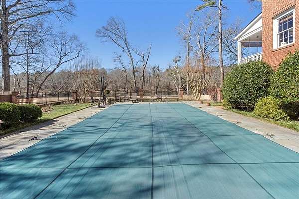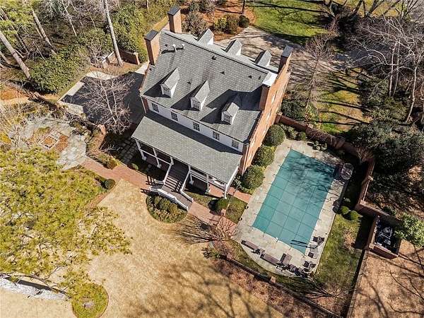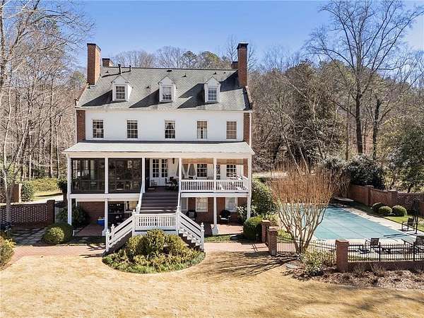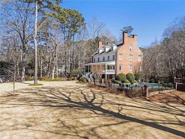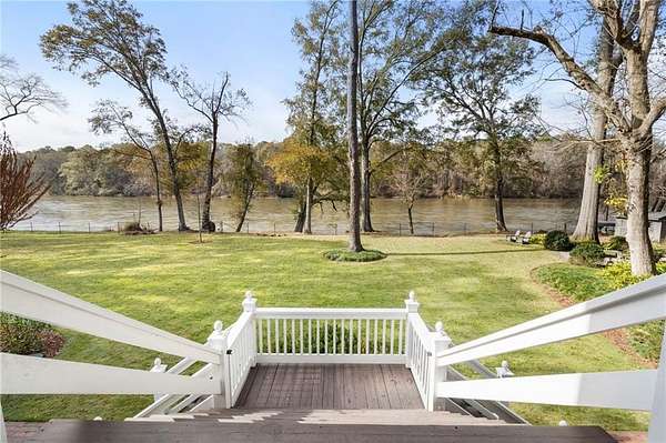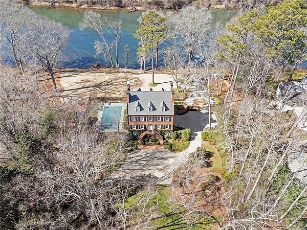 Set on over an acre and a half along the Chattahoochee River, this stately Federal-style residence was modeled after the historic Davenport House in Savannah and offers rare, unobstructed river views and an exceptional, fully flat backyard. The grounds are truly special, featuring a swimming pool surrounded by bluestone, a beautiful courtyard with fountain, and a charming riverside outbuilding with dedicated canoe storage. The setting is peaceful and private, with expansive sightlines to the river that are unmatched by surrounding properties. The home's main level is designed with both elegance and livability in mind. A large formal dining room connects directly to the kitchen, creating an ideal layout for entertaining. The kitchen, sunroom, and primary bath were thoughtfully redesigned by architect Norman Askins, blending classic architectural detail with everyday functionality. The kitchen is centered around a substantial island with generous workspace, stainless steel appliances, and custom cabinetry, and opens naturally to the sun-filled breakfast room. The adjoining sunroom is wrapped in floor-to-ceiling iron-framed windows with French doors leading to the covered porch. From the kitchen, sunroom, and wood-paneled family room, there are sweeping views of the river, reinforcing the home's strong connection to its setting. The main level also includes a wood-paneled family room with a fireplace that opens directly to the porch, as well as a second light-filled living space at the front of the home. The covered porch is a true extension of the main level, offering ample room for both seating and dining while overlooking the flat backyard and river beyond. It provides an ideal space to relax, entertain, and enjoy the surrounding grounds. The second level features a spacious primary suite with peaceful river views, window bench seating, a large walk-in closet, and a well-appointed bath with separate vanities, a soaking tub, and a walk-in shower. Two additional generously sized bedrooms share a Jack-and-Jill bath, and a thoughtfully placed laundry room offers ample storage and everyday convenience. The secondary bathroom on this level includes a steam shower. The third level adds two more bedrooms, each with large walk-in closets and a shared bath, providing flexible space for guests, offices, or additional living needs. The terrace level expands the home's living space with a daylight-filled living area featuring a fireplace and walk-out access to the backyard and river beyond. With an additional bedroom and full bath, this level is well suited for a guest or in-law suite, offering privacy while maintaining easy access to the main living areas and outdoor grounds. Set within the Winterthur community of Sandy Springs, the neighborhood is known for its estate-sized properties, Chattahoochee River access, and quiet streets without through traffic. Despite its private setting, the location offers convenient access to major highways, Truist Park, and a wide range of well-regarded public and private schools. Together, the setting, land, and classic architecture create a truly distinctive offering.