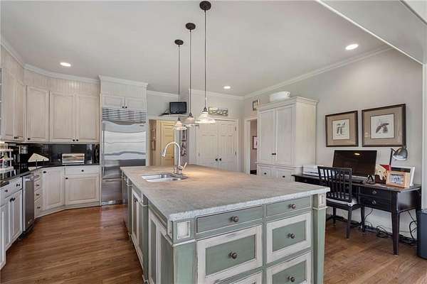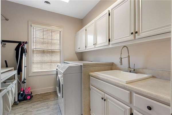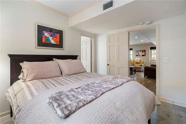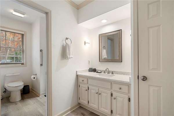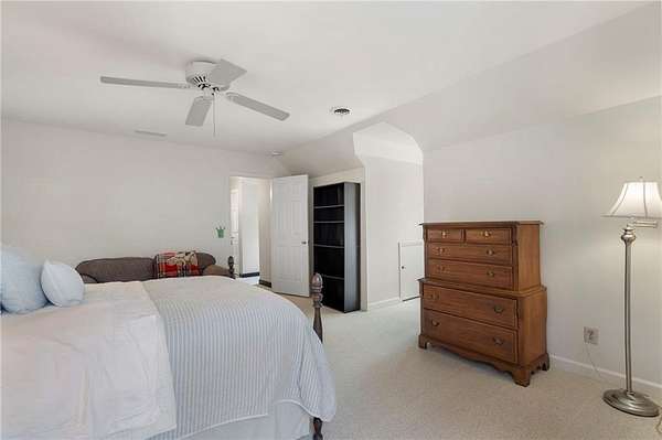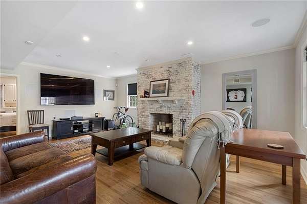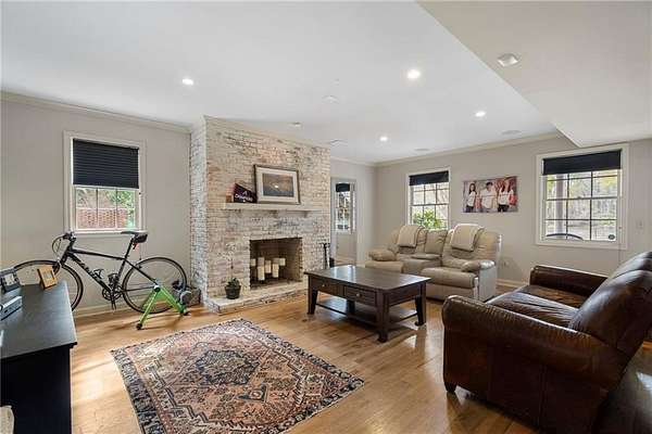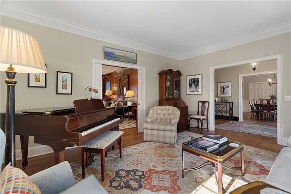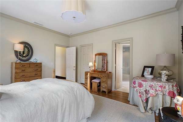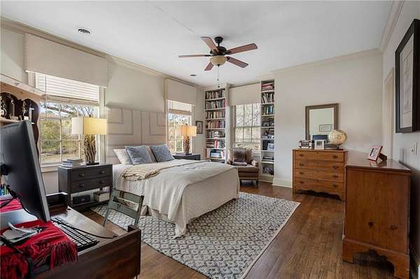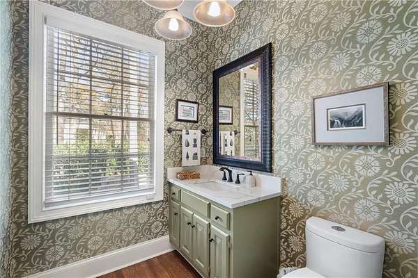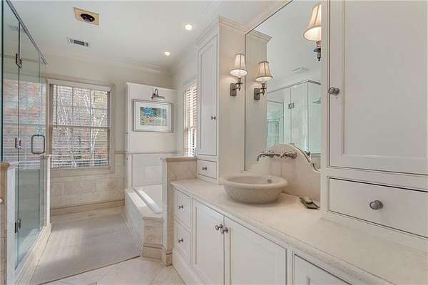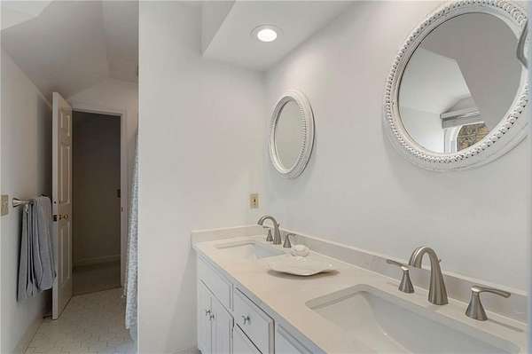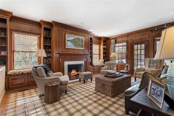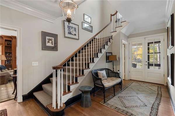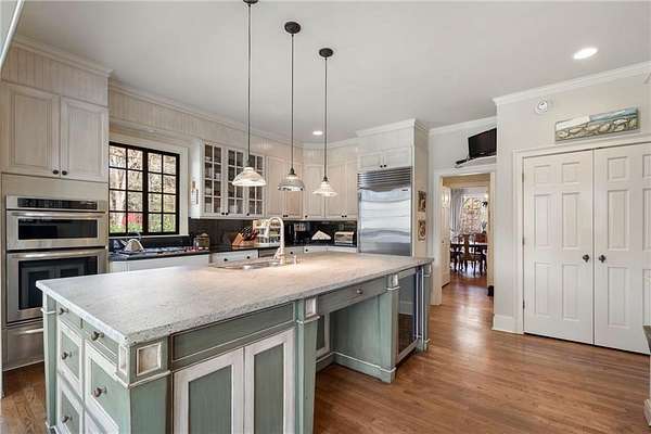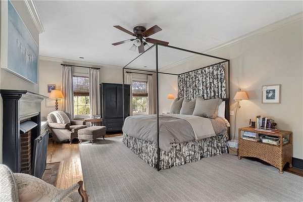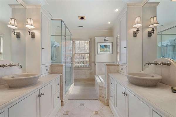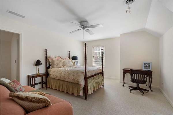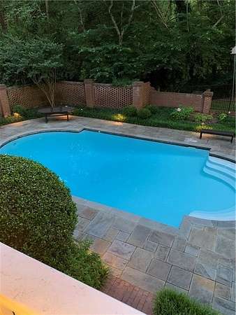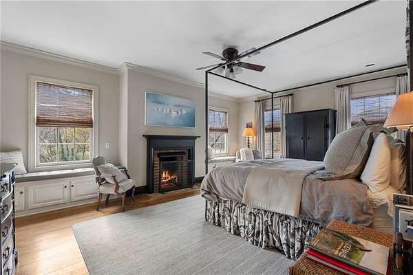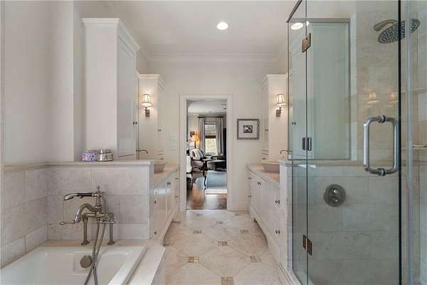 Set on over an acre and a half along the Chattahoochee River, this stately Federal-style residence was modeled after the historic Davenport House in Savannah and offers rare, unobstructed river views and an exceptional, fully flat backyard. The grounds are truly special, featuring a swimming pool surrounded by bluestone, a beautiful courtyard with fountain, and a charming riverside outbuilding with dedicated canoe storage. The setting is peaceful and private, with expansive sightlines to the river that are unmatched by surrounding properties. The home's main level is designed with both elegance and livability in mind. A large formal dining room connects directly to the kitchen, creating an ideal layout for entertaining. The kitchen, sunroom, and primary bath were thoughtfully redesigned by architect Norman Askins, blending classic architectural detail with everyday functionality. The kitchen is centered around a substantial island with generous workspace, stainless steel appliances, and custom cabinetry, and opens naturally to the sun-filled breakfast room. The adjoining sunroom is wrapped in floor-to-ceiling iron-framed windows with French doors leading to the covered porch. From the kitchen, sunroom, and wood-paneled family room, there are sweeping views of the river, reinforcing the home's strong connection to its setting. The main level also includes a wood-paneled family room with a fireplace that opens directly to the porch, as well as a second light-filled living space at the front of the home. The covered porch is a true extension of the main level, offering ample room for both seating and dining while overlooking the flat backyard and river beyond. It provides an ideal space to relax, entertain, and enjoy the surrounding grounds. The second level features a spacious primary suite with peaceful river views, window bench seating, a large walk-in closet, and a well-appointed bath with separate vanities, a soaking tub, and a walk-in shower. Two additional generously sized bedrooms share a Jack-and-Jill bath, and a thoughtfully placed laundry room offers ample storage and everyday convenience. The secondary bathroom on this level includes a steam shower. The third level adds two more bedrooms, each with large walk-in closets and a shared bath, providing flexible space for guests, offices, or additional living needs. The terrace level expands the home's living space with a daylight-filled living area featuring a fireplace and walk-out access to the backyard and river beyond. With an additional bedroom and full bath, this level is well suited for a guest or in-law suite, offering privacy while maintaining easy access to the main living areas and outdoor grounds. Set within the Winterthur community of Sandy Springs, the neighborhood is known for its estate-sized properties, Chattahoochee River access, and quiet streets without through traffic. Despite its private setting, the location offers convenient access to major highways, Truist Park, and a wide range of well-regarded public and private schools. Together, the setting, land, and classic architecture create a truly distinctive offering.