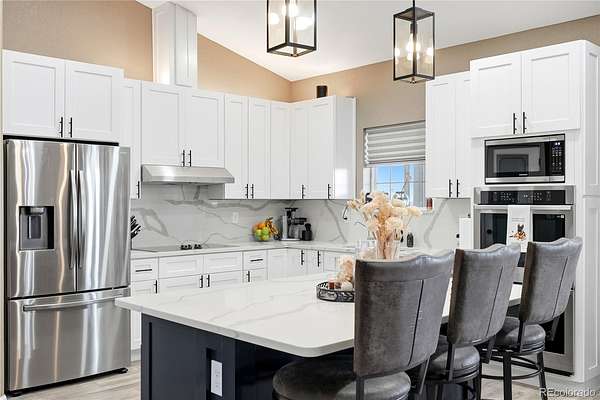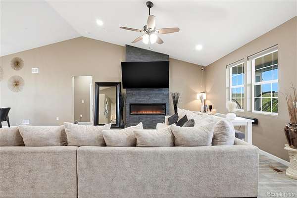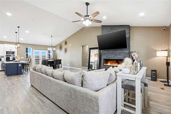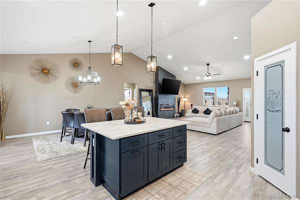 From the moment you step inside, you’re greeted by vaulted ceilings, abundant natural light, and an open-concept design that creates a warm and inviting atmosphere. The kitchen is the heart of the home, featuring quartz countertops, a large island, and a walk-in pantry, seamlessly flowing into the main living area anchored by a cozy fireplace.