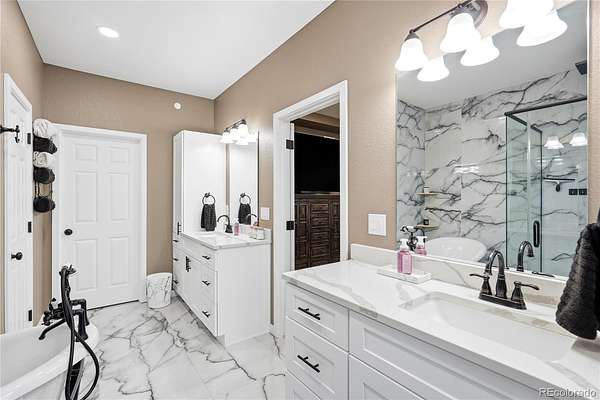 The main level offers a spacious primary suite designed as a true retreat, complete with a spa-like bathroom featuring a soaking tub, oversized walk-in shower, and dual vanities. Three additional bedrooms, a full bathroom, a powder bath, and a well-appointed laundry room complete the main level.