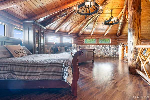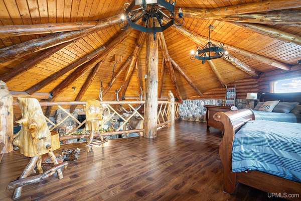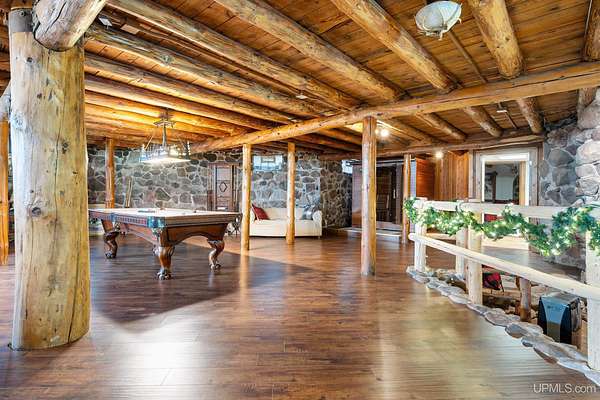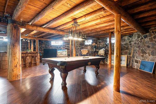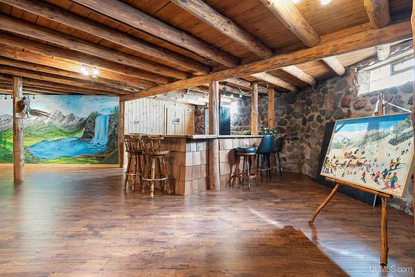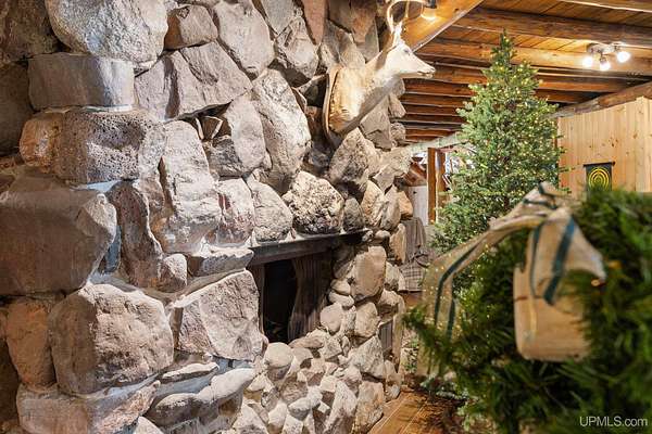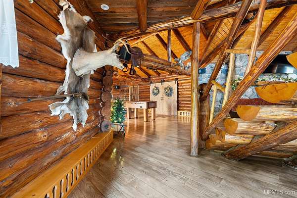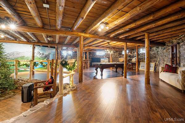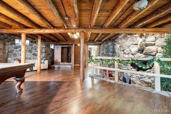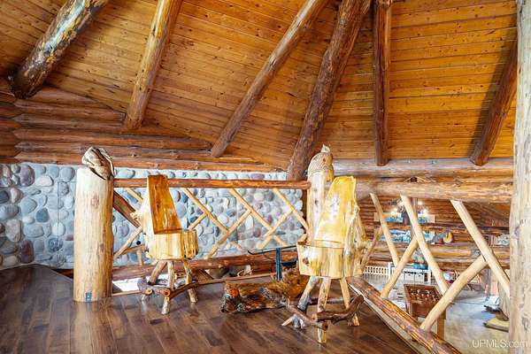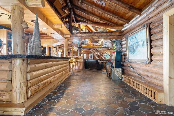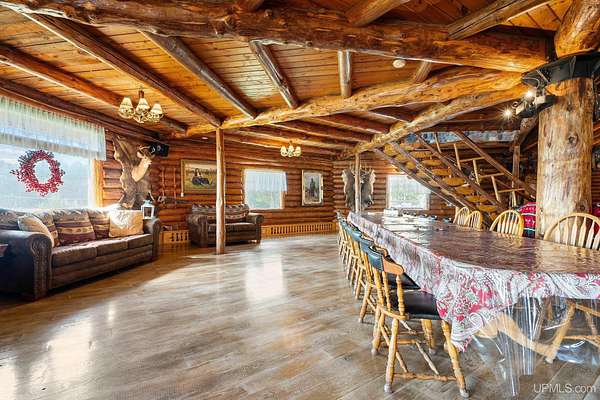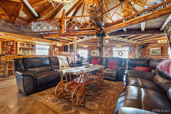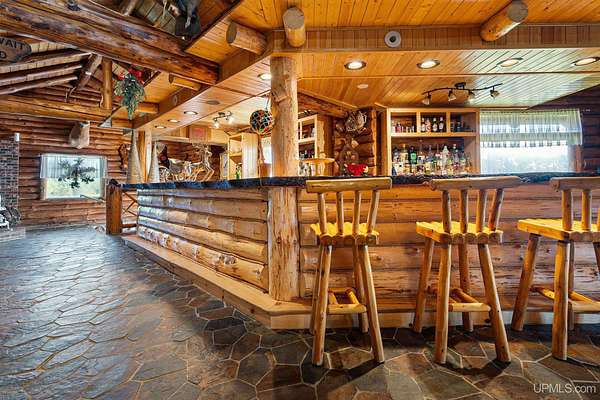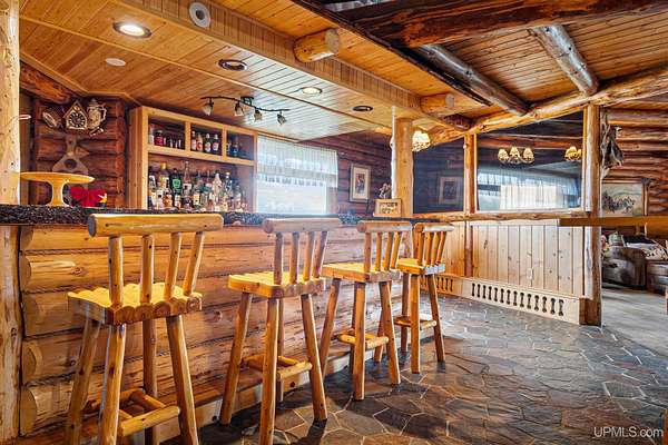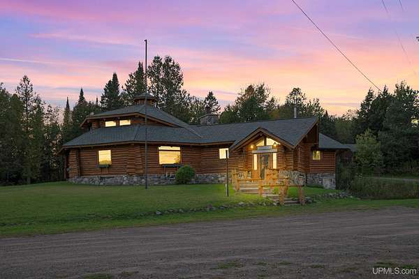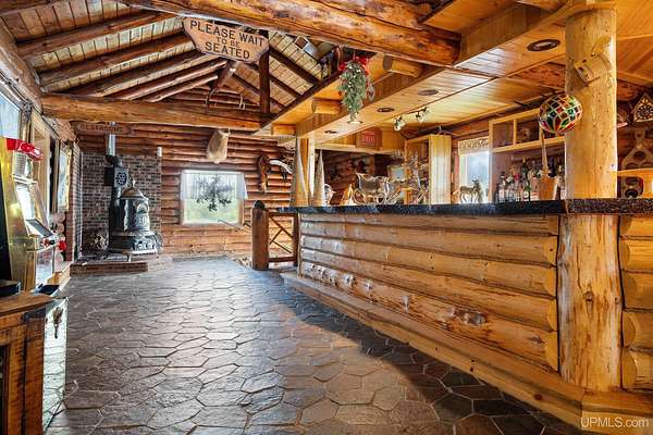 Incredible full log home with Acreage, Pond, and rental income with prime high traffic location! This 7000+ sq ft treasure is just waiting to be found. The renovations and improvements exceed the asking price. The unit also comes fully furnished with exquisite decor, wood carvings, and artwork. There are bars on both levels with a grand dining area on the main floor where you will find the massive stone fireplace. You'll also find a full kitchen and 2bathrooms. An impressive log staircase leads to the loft area overlooking the main floor. The lower level offers it's own fireplace ,another bar, sauna, and 3 bedrooms. The home has been a successful rental property for the last 2 years, but could be utilized as a restaurant, business, or whatever your imagination can dream. The highway location combined with the Acreage and proximity to ski hills, snowmobile and ORV trails, Lake Superior, world famous Copper Peak ski jump, and much more provide endless possibility. Come take a look at this unique gem before it's gone!