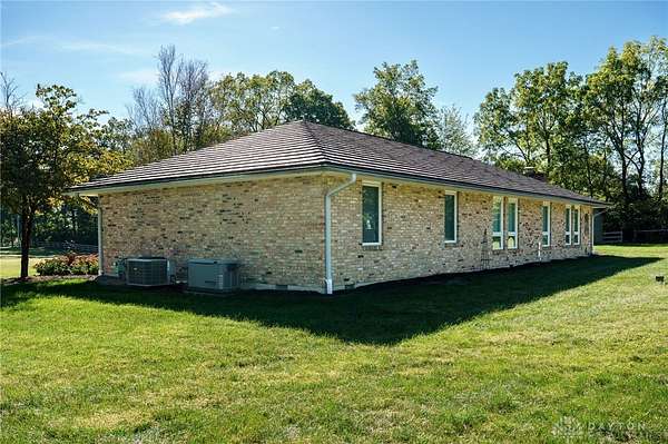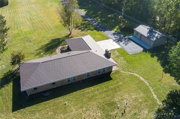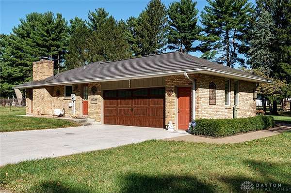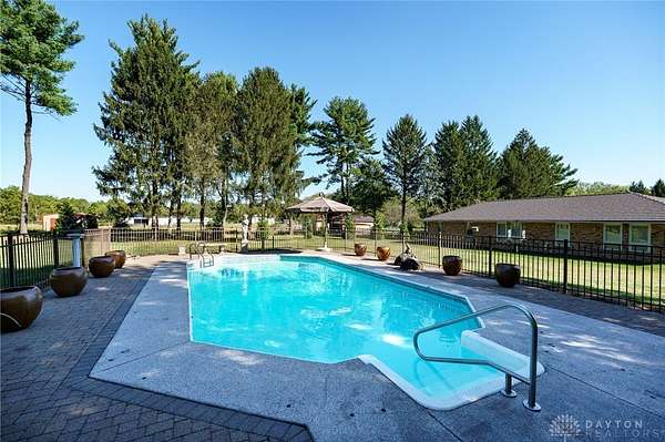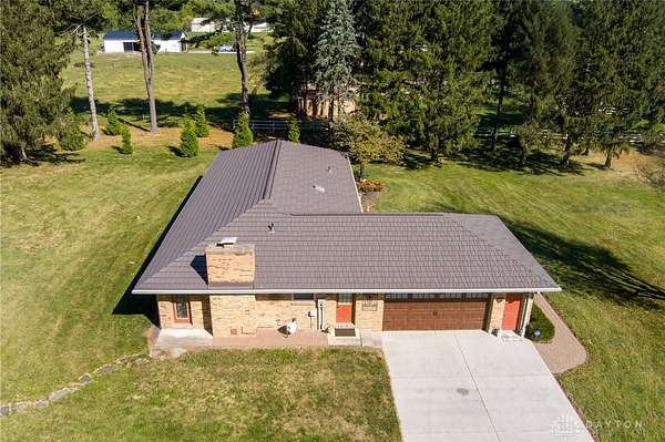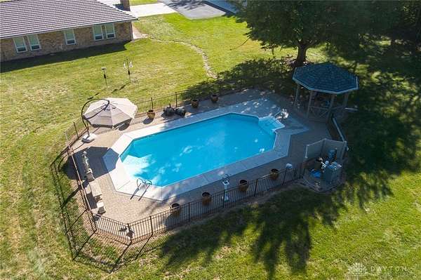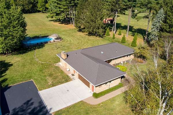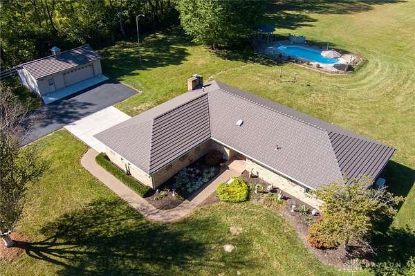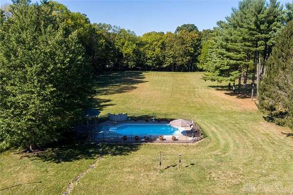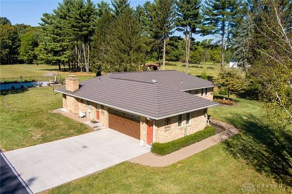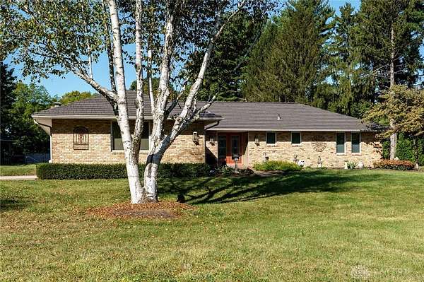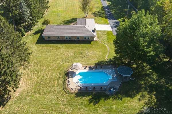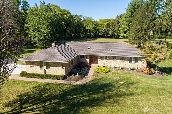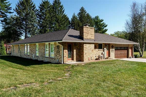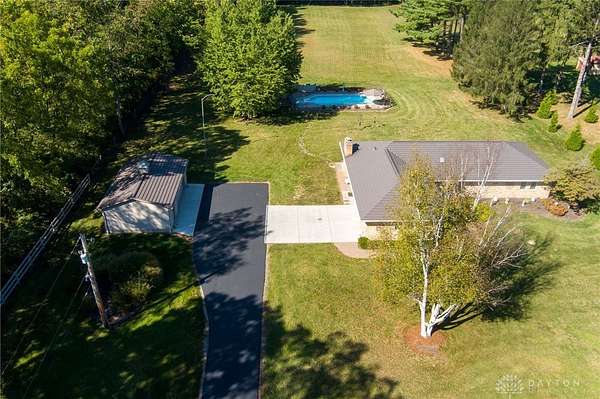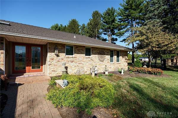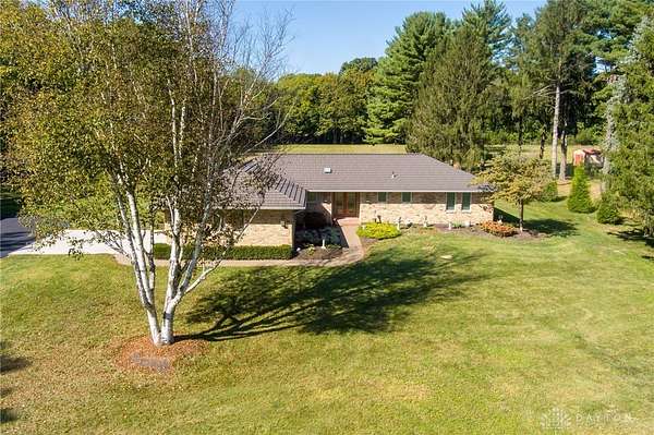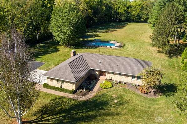 Welcome to 5975 Hunter Road, a meticulously maintained custom home set on 5.37 acres of beautiful, park-like land with a private woodline in desirable Mad River Township. This thoughtfully designed home offers high-end finishes throughout and a layout that balances comfort, privacy, and function. You're greeted by a spacious entryway that flows into a warm living and dining area, with a large kitchen just beyond featuring ample cabinetry, Corian countertops, high-end appliances. The tucked-away family room boasts custom built-in shelving and a welcoming gas fireplace, while all three generous bedrooms are thoughtfully separated from the main entertaining areas. The utility room includes a wash sink, and washer/dryer, while the lower level adds even more value with a large rec room, dedicated office space with custom stainglass , and a generous storage area. Over $60K worth of updates in the last 5 years and over $240K in updates in the last 10 years! Additional highlights include An attached 2-car garage and a detached 2.5-car garage with electricity and water, plus fenced-in heated in ground pool, whole-house Generac generator (2015), metal shake roof and gazebo (2023), leaf guard gutter system with underground drainage (2023), high-end Pella windows, California Closets built in and countertops throughout! Thoughtfully designed to max out storage in working space, updated LED lighting, two custom stained glass windows, Bryant HVAC system (2016), and a newly paved asphalt driveway (2023). Over 15 transferable warranties that can be provided to the new owner! A true one-of-a-kind property, offering luxury, privacy, and functionality--close to I-675, I-70, shopping, eateries, and WPAFB, while still maintaining a Low-traffic, country-style feel!
