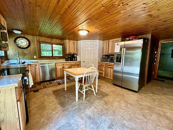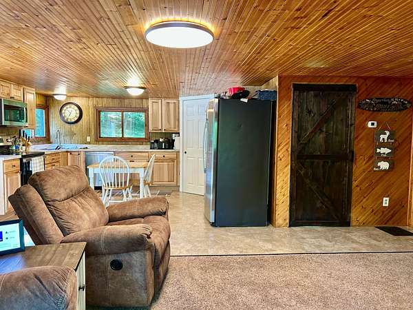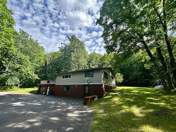 BEAUTIFUL COUNTRY RETREAT ON 3.6 ACRES! Welcome to your peaceful Northwoods escape! This newly remodeled 3-bedroom, 1-bath home is nestled on 3.645 wooded acres and adjoins State of Wisconsin land-giving you room to explore and the serenity of nature at your doorstep. Enjoy morning coffee on the open sun deck, watch wildlife roam in the yard, or hop on your ATV/UTV directly from the property. Inside, this charming home offers a warm, inviting layout. The upper level features an open-concept kitchen and living room with stunning hickory cabinets, a pantry, and tongue-and-groove ceilings and walls for that perfect rustic touch. Two spacious bedrooms and a full bath complete the upper level. Downstairs, you'll find a cozy family room, laundry area with storage, and a third bedroom. Additional features include a drive-under 1-stall garage, paved blacktop driveway, three apple trees, and tons of privacy in a scenic country setting. Call today to experience the beauty of country living!