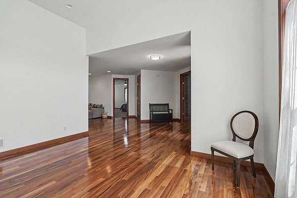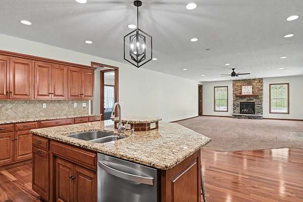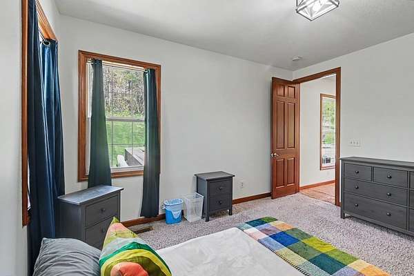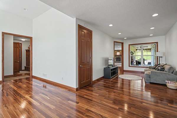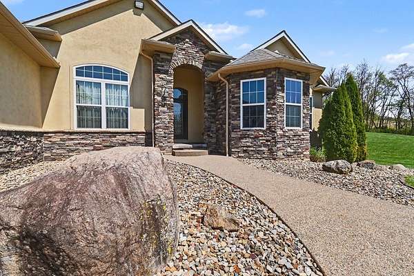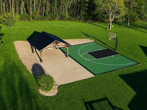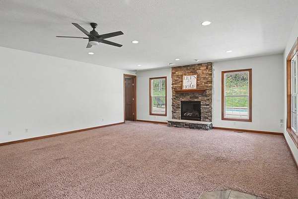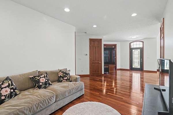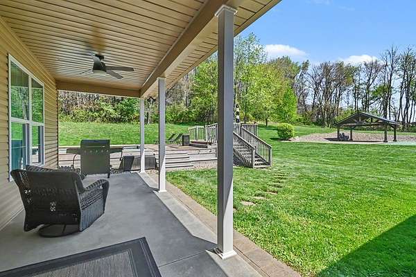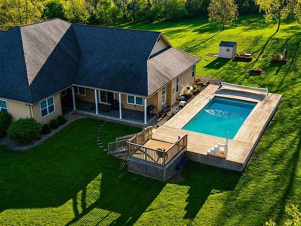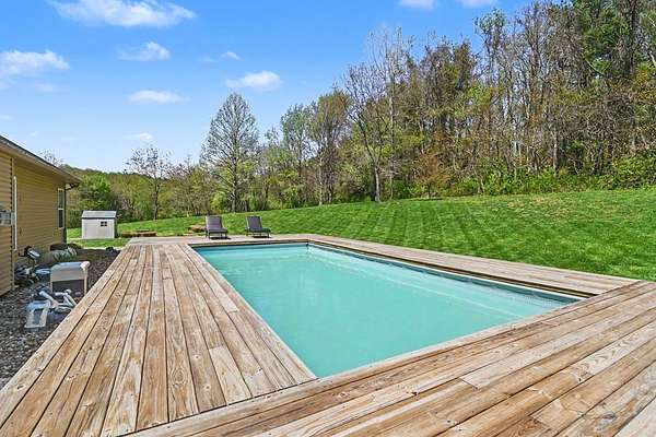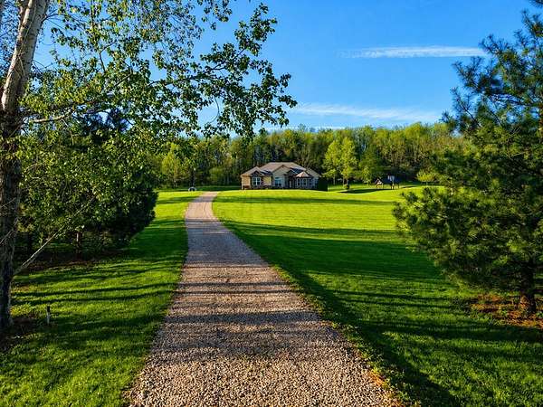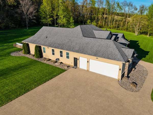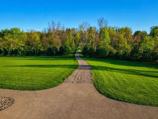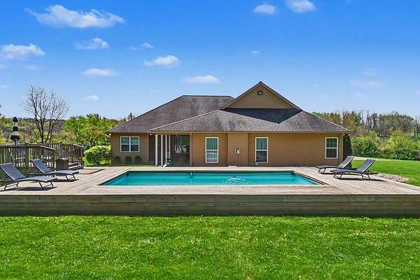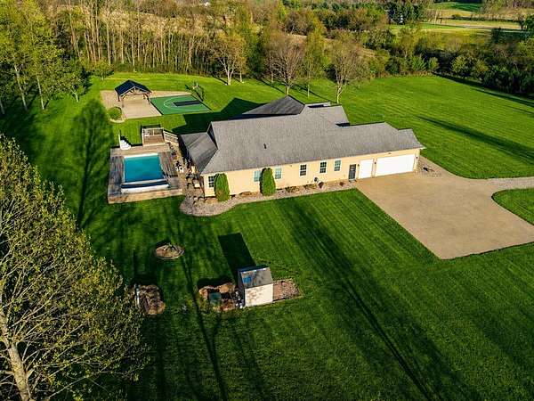 Tucked away on just over 20 wooded acres, this private estate feels like your own hidden retreat where luxury, space, and unforgettable entertaining come together. This 4-bedroom, 4.5-bath home offers over 3,500 square feet with Brazilian hardwood floors, sun-filled spaces, and stunning views in every direction. The kitchen features Schrock cabinetry, granite countertops, deep drawers, and a massive angled island with built-in electric and a moveable top for added space when needed. The finished lower level is designed for hosting with a custom bar, 9-foot ceilings, a separate entrance ideal for gatherings, and potential for a 5th bedroom. Outside, enjoy a resort-style setting with a pool and deck, pavilion, and half basketball court. The grounds have been extensively improved, including a fully leveled and tiled front yard area larger than a football field, plus an expanded driveway for ample parking. Surrounded by mature trees and private trails, this is a true escape.