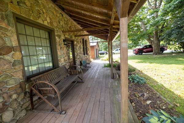 The exterior showcases stone veneer (added in the 1980s), cedar accents, and vinyl siding for durability.