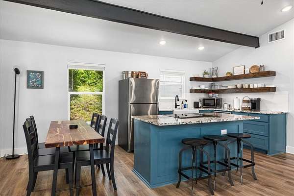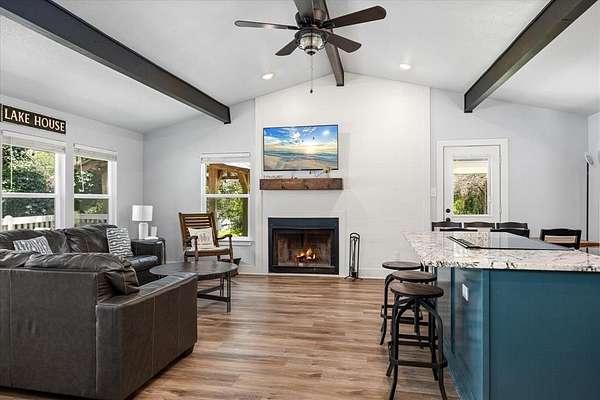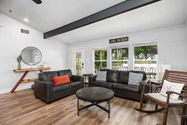 Set on multiple expansive lots, this property is more than just a vacation home. It's a unique investment opportunity. With ample space to add additional tiny homes, casitas, or cabins, this site is ideal for growing your short-term rental portfolio or developing a lakefront wedding venue, glamping resort, or event space. The mature trees, scenic backdrop, and gentle slope to the water create a naturally inviting setting for celebrations or retreats. Inside the home, you'll find warm, rustic charm with modern updates: open-concept living and dining, a well-equipped kitchen, cozy bedrooms, and large windows overlooking the water. Guests rave about the peaceful sunrises from the private deck and nights around the firepit under Texas stars.