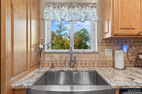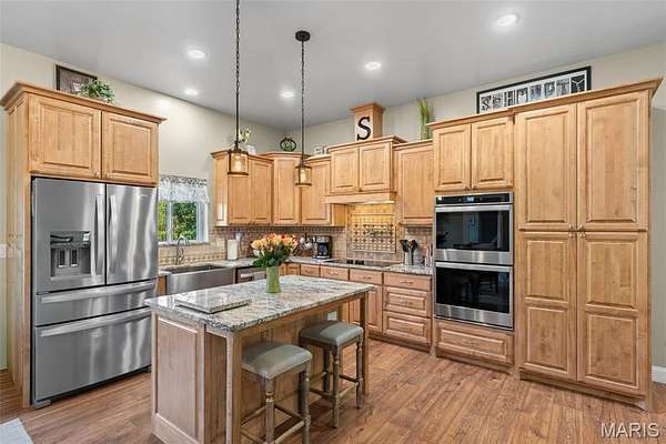 Discover this modern ranch home with over 3200 sq ft of inspired total living space nestled on 6.35+/-acres. Step into the bright open rooms with soaring 9' & 10' ceilings and a thoughtful divided floor plan. Beautiful Quaker French doors at the front of home offers so much natural light. Large living room with a double-sided/divided fireplace shared with kitchen. Kitchen/dining combo with eat-in island, gorgeous hickory cabinets, granite countertops, backsplash, stainless steel appliances, & pot filler faucet over the stove. Luxurious primary bedroom suite with walk-in closet, tub & separate shower. Primary bedroom & dining room lead out the the balcony overlooking the serene view of the pond, trees & wildlife. 2 additional bedrooms. Main floor laundry with concrete countertop & cabinetry. Walk-out lower level finds you an enormous recreation room, charming kitchenette, bonus room, 2 sizable bedrooms and a vault or shelter area. 2-car oversized attached garage. APPROX. 2000 SQ FT.+/- DETACHED GARAGE IS A TRUE TURNKEY WORKSPACE, features two 14' doors, soaring ceilings, suitable for RV parking and hookup, office space, kitchenette and full bath. Additional storage/parking is available in a 20 x 20 garage. Great curb appeal with the country style covered front porch & a private backyard setting featuring a large stamped patio with lighting & hot tub all great for entertaining or relaxing! Make your appointment today!