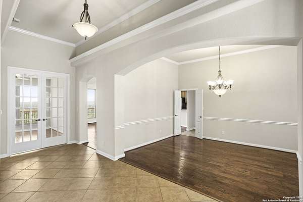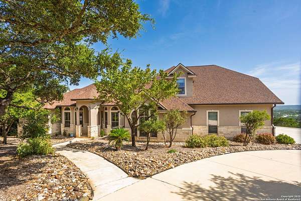 Tucked away in a quiet cul-de-sac, this meticulously maintained, one-owner home offers sweeping views for miles and exceptional privacy surrounded by mature trees. With 3,814 square feet of thoughtfully designed living space, this 4-bedroom, 3.5-bathroom home features a flexible layout with a dedicated office, elegant library with built-in bookcases, and a spacious game room. Enjoy breathtaking scenery from the upstairs balcony, kitchen window, or right from your primary suite. The main level includes the primary bedroom, a secondary bedroom with an en suite bath, a stately library, private office, and a convenient half bath. Upstairs you'll find two additional bedrooms, a full bath, and a large game room complete with built-in sink and beverage fridge, ideal for entertaining or movie nights. The kitchen boasts brick accent details that add warmth and character, double ovens, and ample cabinetry, while unique accent windows throughout the home bring in natural light and architectural charm. The side-entry 3-car garage offers great curb appeal and functionality. With thoughtful custom finishes, peaceful surroundings, and plenty of room to roam, this home perfectly blends luxury, comfort, and Hill Country charm.