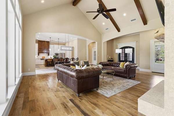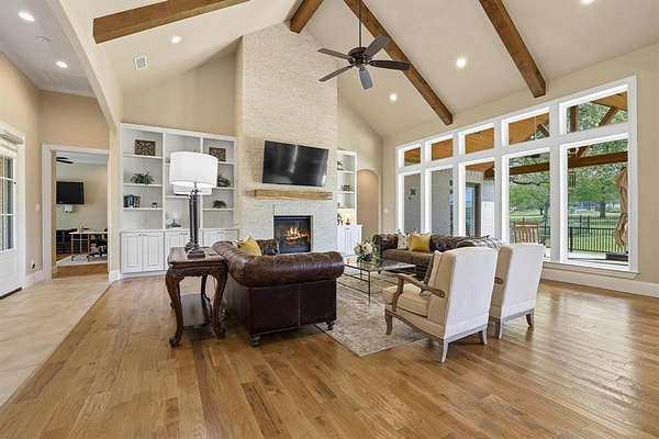 Step inside to soaring ceilings, beautiful exposed wooden beams, and a striking brick fireplace with gas logs that anchors the main living area. The home is filled with incredible natural light, highlighted by a wall of front-facing doors and abundant windows throughout.