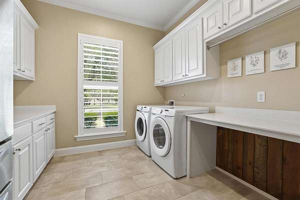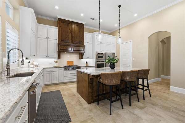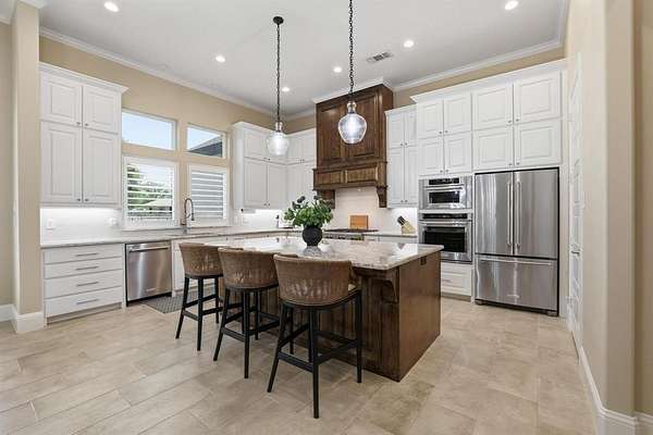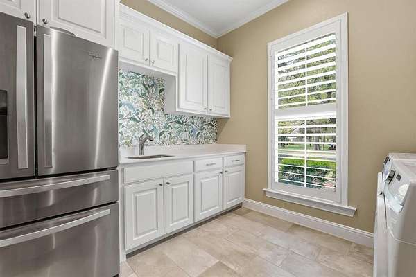 Additional highlights include a 3-car garage and a spacious utility room with sink, extra storage, room for a secondary refrigerator, and a folding counter.