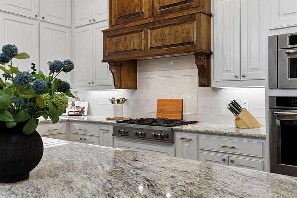 The chef’s kitchen is designed for both style and function, featuring stainless steel KitchenAid appliances, granite countertops, a custom pantry, butler’s pantry, and beautiful wood accents on the vent hood and island. Rich oak hardwood flooring runs throughout the main living areas, complemented by custom tile in all wet spaces.
